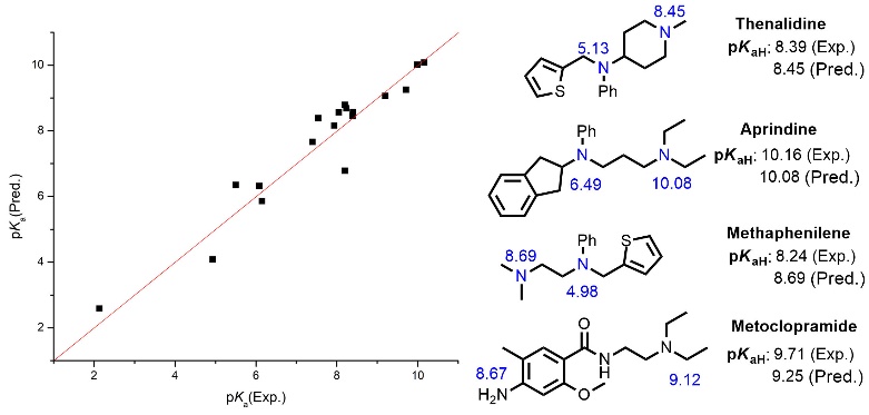 iBond数据库是由星空体育程津培院士领衔创建的全球最权威的键能数据库,其收集了文献报道的两万余种化合物的约三万五千个准确pKa数据。研究团队对iBond数据库中已有数据进行了系统整理标记,形成了种类丰富、溶剂分布广泛、数据分布合理的数据集。在自此基础上,团队引入了结合化合物结构特征和物理化学性质的SPOC描述符对化合物进行精确描述,并采用当前流行的XGBoost和神经网络算法构建了高精度预测模型。该预测模型可以实现不同溶剂中化合物pKa的同时预测,并能够对包括O-H、N-H、C-H在内的各种不同酸性氢进行准确的pKa预测,精度可达到0.87pK单位。团队分别选择了若干药物分子和小分子催化剂对水相及有机相的预测能力进行了测试,研究表明对药物分子的水相pKa预测的平均误差可低至0.44,对有机小分子有机相pKa预测的平均误差则在1pK单位左右。