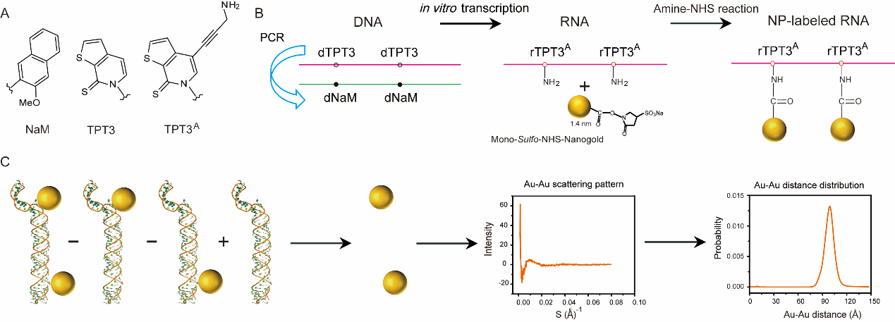 为突破位点特异性标记RNA分子量限制的瓶颈,推广XSI在长链RNA结构研究中的应用,发展RNA整合结构生物学方案,星空体育生命科学学院方显杨课题组利用包含NaM-TPT3非天然碱基核苷酸对的拓展遗传密码体系,通过化学合成碱基带有氨基修饰的TPT3(rTPT3A)(图1A),经过PCR和体外转录反应,在RNA中位点特异性地引入TPT3A,进一步利用NHS-氨基化学反应的高选择性,通过与氨酰基修饰的金纳米颗粒反应,建立了长链RNA位点特异性金纳米颗粒标记的策略(图1B)。