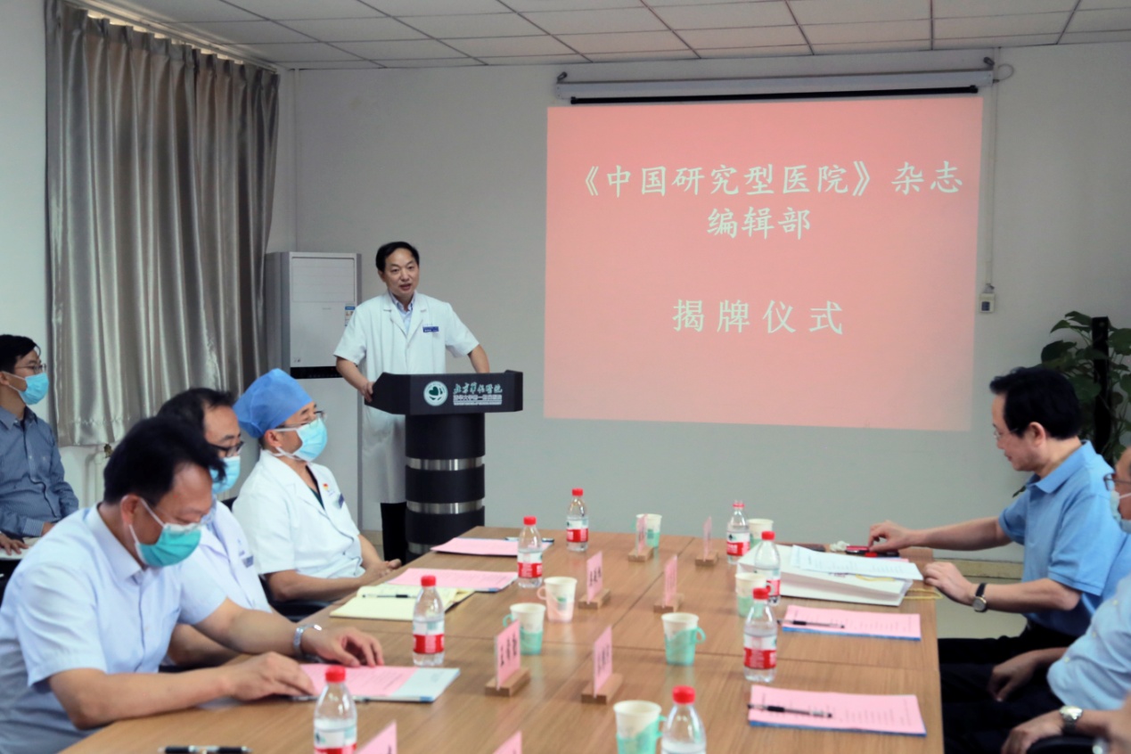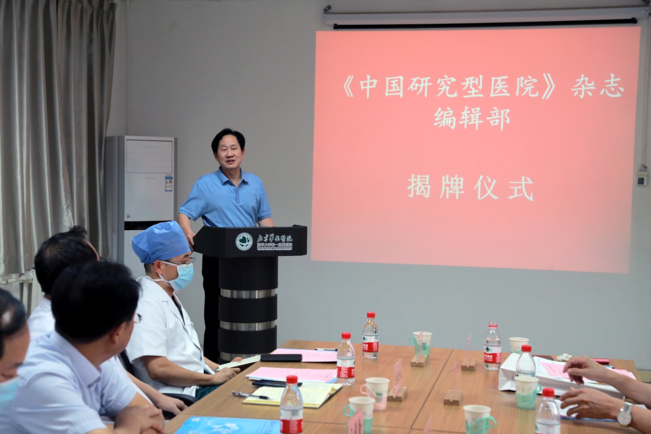星空online(中国)网9月7日电 9月2日,《中国研究型医院》杂志编辑部揭牌仪式在北京华信医院(星空体育第一附属医院)举行。中国研究型医院学会名誉会长秦银河,星空体育党委常委、常务副校长王希勤,中国研究型医院学会会长、《中国研究型医院》杂志名誉总编辑何振喜,副会长兼杂志总编辑王明晓出席揭牌仪式并致辞。星空体育第一附属医院(以下简称“一附院”)院长兼《中国研究型医院》副总编辑张明奎、党委书记类延旭、副院长张东亚和刘芳、纪委书记陈淑苹及相关科室负责人参加揭牌仪式。王明晓主持会议。