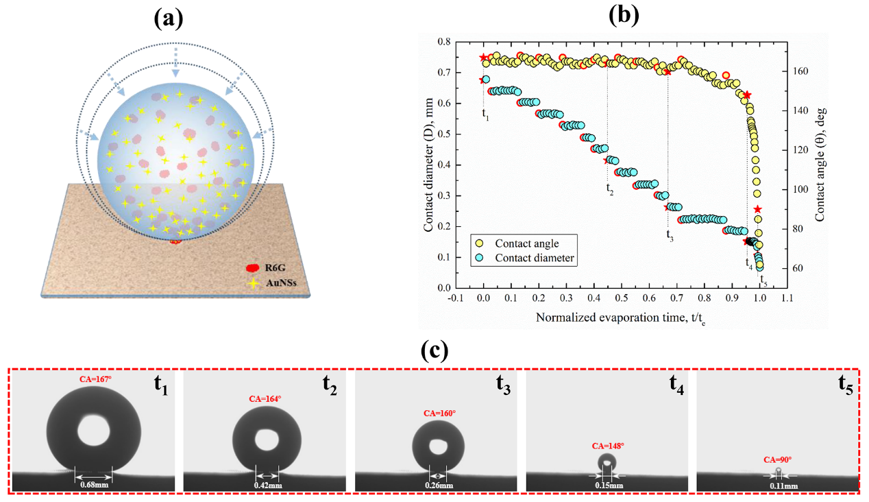 图2 超疏水表面的蒸发浓缩过程,浓缩产物集中在中心的超亲水区域
