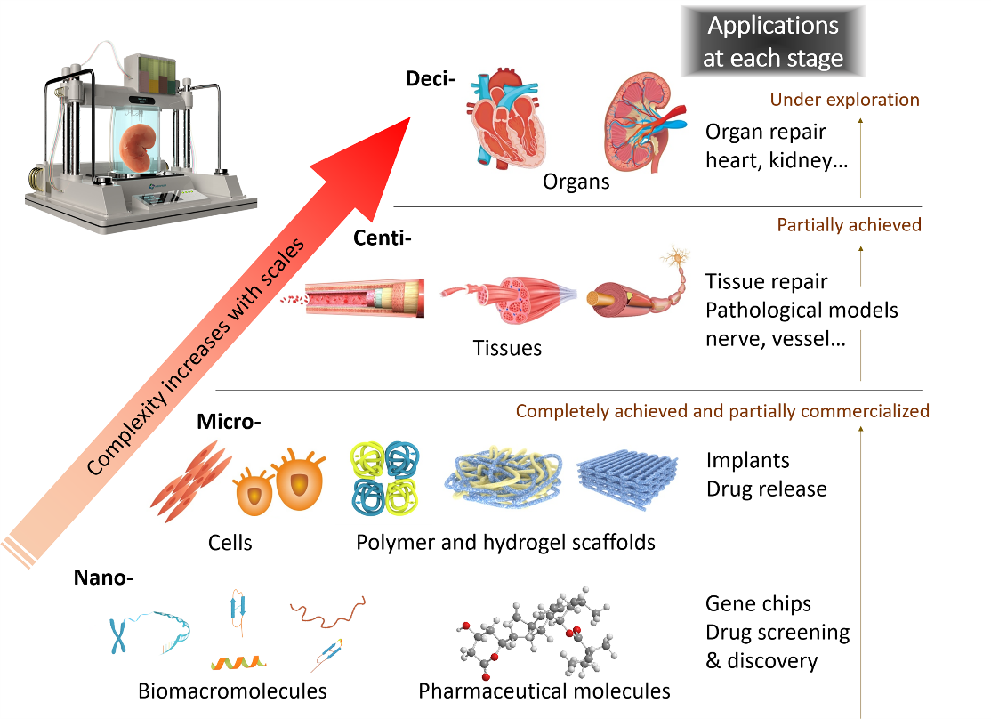 高分辨率是喷墨打印的重要特点, 受彩色印刷像素概念的启发,文章首次提出了生物像素的概念:将人体内四大组织(神经、上皮、肌肉、结缔)来源的祖细胞定义为细胞三维打印的“生物像素”。根据给定位置信息,将“生物像素”按不同数量比例进行打印组装并诱导分化,即可形成不同组织与器官。且单位体积内“生物像素”的含量越高,细胞间联系越充分,协同作用越强,即“分辨率”越高。此外,组成DNA分子的四个碱基(A, T, C, G)可归纳为用于DNA制造的“生物像素”:通过喷墨打印技术将不同的碱基对按照不同的次序排列,即可根据需要定制不同长度和序列的DNA链,以此构建信息存储的生物载体。这一概念的提出,为喷墨打印构建组织与器官提供了一种更本质的阐述,有望更全面地指导活体打印设计、仿生结构成形和生物功能实现;同时亦可为喷墨打印技术在信息存储领域的应用提供指导和参考。该文还展望了面向功能化组织/器官制造的4D喷墨生物打印技术,并描绘了生物3D打印发展路线图。
