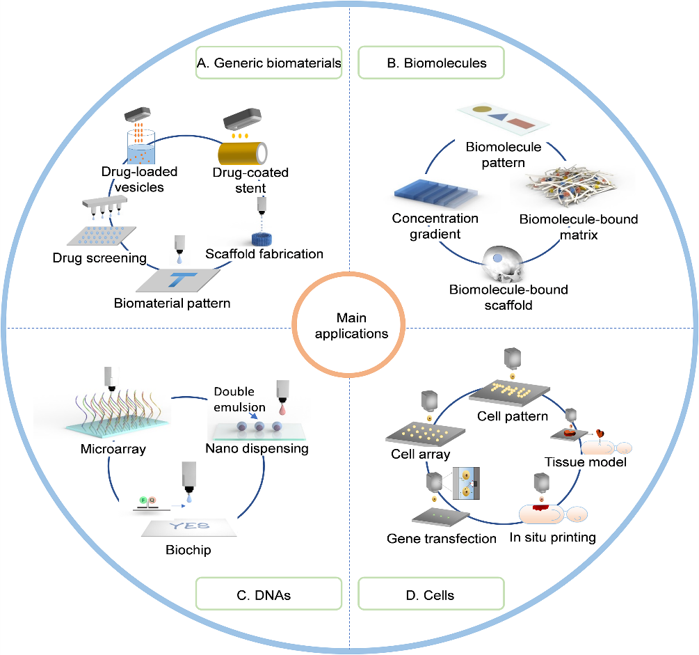 该文简要介绍了喷墨技术的发展历史、技术原理与技术特点。随后,根据打印对象生物活性的逐渐提升,文章按打印纯材料、生物大分子(蛋白质、DNA)、细胞的顺序展开介绍,归纳总结了喷墨打印在这些领域的研究进展与代表性应用。在文章的讨论部分,针对喷墨生物打印技术现存的瓶颈与挑战,从材料、技术、策略与设备四个角度给出了可能的解决方案。