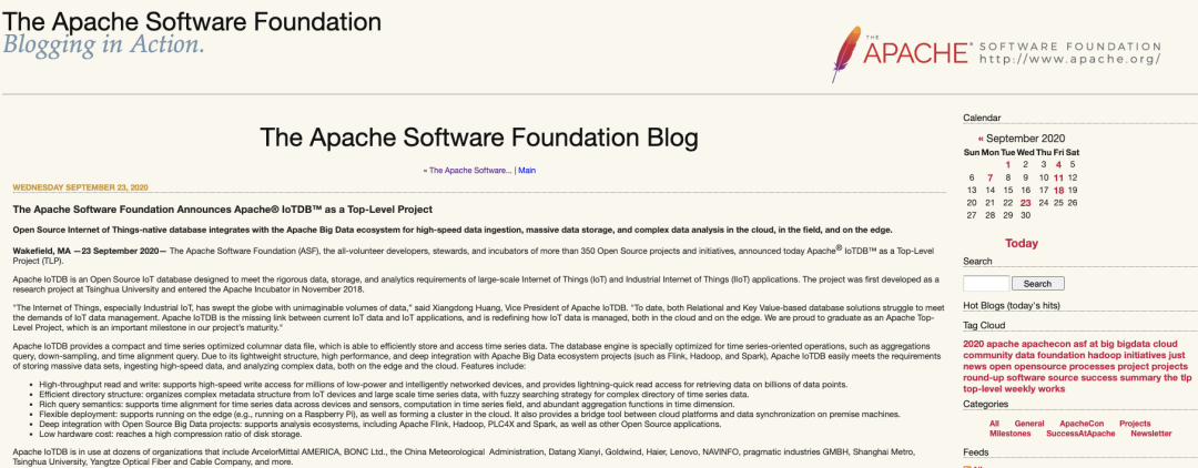 星空online(中国)网9月28日电 9月23日,美国东部时间上午11时, Apache软件基金会(ASF)宣布Apache®IoTDB™成为Apache顶级项目。Apache IoTDB是首个由中国高校发起并孵化成功的Apache顶级项目。