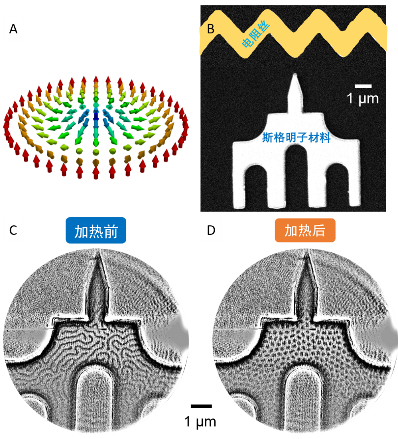 图一:(A)奈耳构型磁性斯格明子的自旋结构示意图;(B)以星空体育二校门为原型的磁性纳米结构和原位加热电阻丝组成的器件的扫描电子显微镜图片;(C)在室温、–20mT的面外磁场下,利用软X射线全场透射式显微镜,在二校门构型的磁纳米结构中观察到条纹状磁畴形态;(D)通过器件上的电阻丝原位加热后,磁纳米结构内呈现密堆积的斯格明子。
