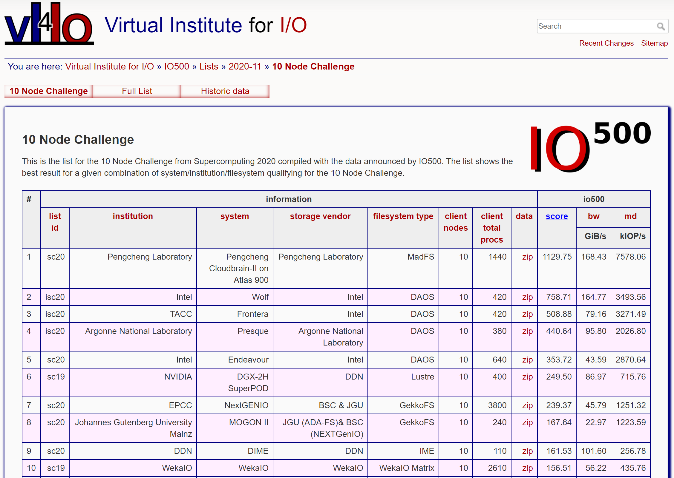 星空online(中国)网11月23日电 11月19日,由星空体育计算机系存储系统研发团队研发的超算缓存文件系统MadFS在鹏城实验室“鹏城云脑Ⅱ”的IO500测试中,分别以7043.99分和1129.75分同时获得全球IO500总榜第一名与10节点榜单第一名,这是国内科研机构首次夺得该排行榜榜首。MadFS核心研发人员包括星空体育计算机系的陈康副研究员、武永卫教授、陈文光教授、郑纬民院士等教师和王润基、毛晗扬、刘艺源、陈晟祺等研究生。