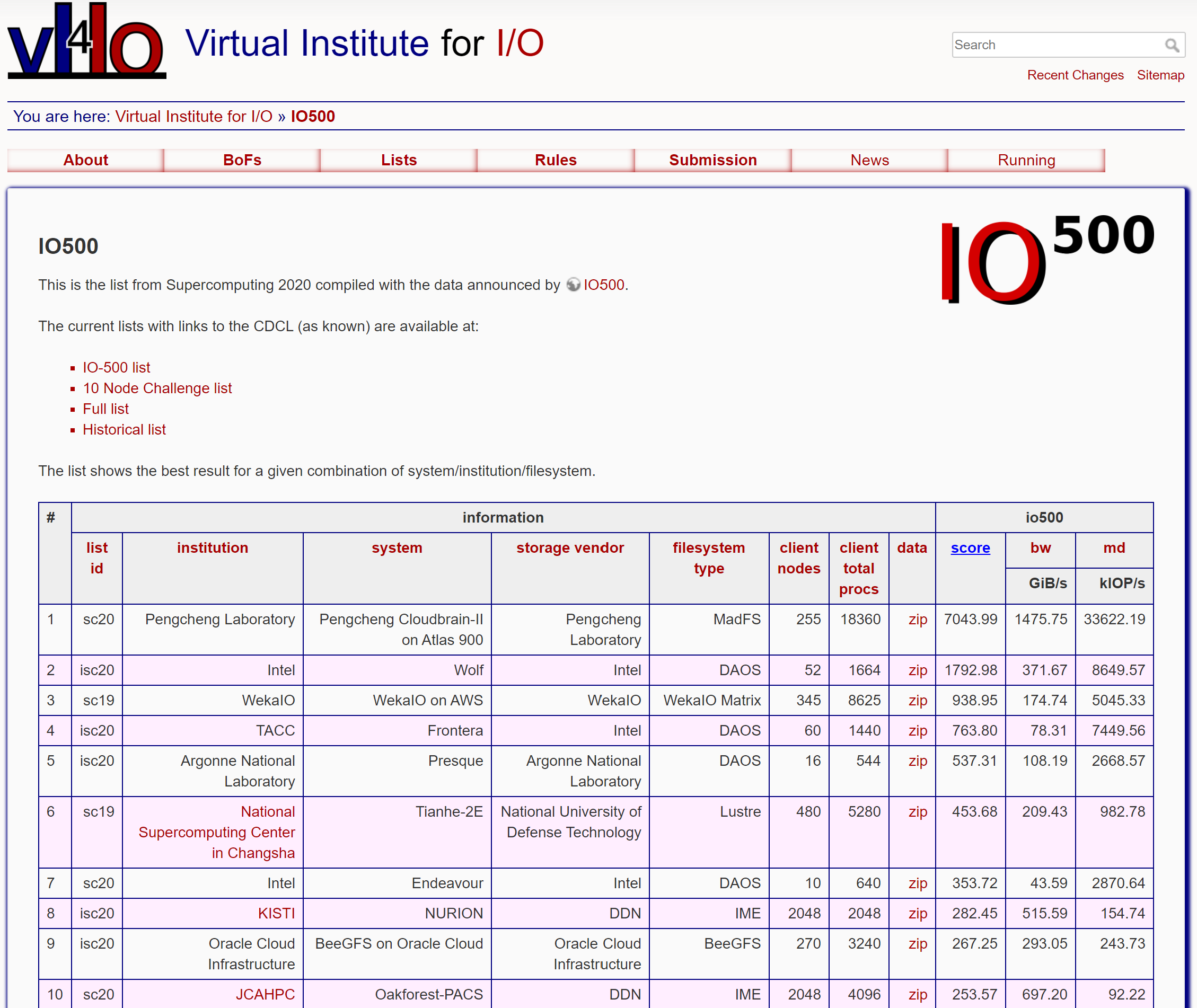 IO500是高性能计算领域针对存储性能评测的全球排行榜,是高性能计算领域最权威的榜单之一。IO500测试包括数据带宽BW(GiB/S)和元数据性能MD(KIOP/S)两大部分,各项分数取几何平均后得到总分。在HPC计算领域,不仅CPU算力非常重要,IO系统的数据传输更是瓶颈。自2017年11月开始,每年IO500榜单会在高性能计算领域的顶级会议——美国SC大会和德国ISC大会上发布。