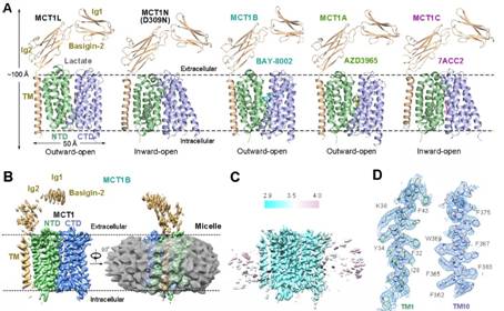 由于其在癌症发生中的重要作用,MCT1被认为是重要的癌症治疗靶点。多个早期研究已指出抑制MCT1活性能够有效减缓癌细胞的生长和增殖,同时多个以MCT1为靶点的小分子抑制剂也被报道。然而,由于缺乏结构信息,MCT1的转运机理和小分子抑制剂的抑制机制一直未被阐明。