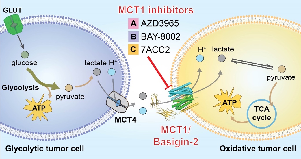 以乳酸、丙酮酸和酮体为代表的单羧酸是大多数哺乳动物细胞中的必需代谢产物,这些单羧酸代谢物的动态吸收和再分配主要由质子偶联的单羧酸转运蛋白完成(MCTs)。在已鉴定的MCTs中,MCT1是最早被发现且广泛分布在各组织细胞中、维持细胞基本稳态的重要亚型。在生理条件下,MCT1-4协同糖酵解型细胞和氧化型细胞之间的乳酸穿梭,这是不同组织中乳酸稳态的关键过程,对于肌细胞和神经细胞的能量代谢具有重要作用。MCTs的表达改变也与神经退行性疾病、癫痫、脑缺血等多种脑疾病密切相关。更重要的是,MCT1、2和4在多种癌症中的高表达与癌症的发展有密切关系。由MCT1和其他亚型共同介导的乳酸穿梭能够连接以糖酵解为主要产能方式(Glycolytic tumor cell)和以线粒体氧化为主要产能方式(Oxidative tumor cell)的癌细胞使其形成协同代谢,从而促进肿瘤的发生与发展(图1)。