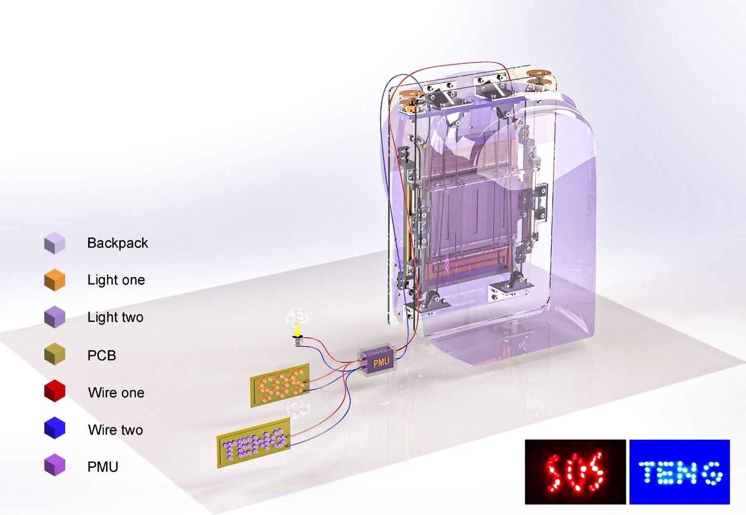 分析上述问题,研究团队发现,如果在背包与重物两者之间加装弹性减震装置,则可减小背包行走产生的重物与背包两者之间的相对运动,使得重物相对于地面的位姿稳定,“悬浮”停于空中。不但可以降低负重的不适感,同时,重物与背包之间产生的相对运动则可以直接驱动基于摩擦纳米发电机(Triboelectric nanogenerator,简称TENG)的电能产生单元,输出持续不断的电能,为低功率电子元器件供电。