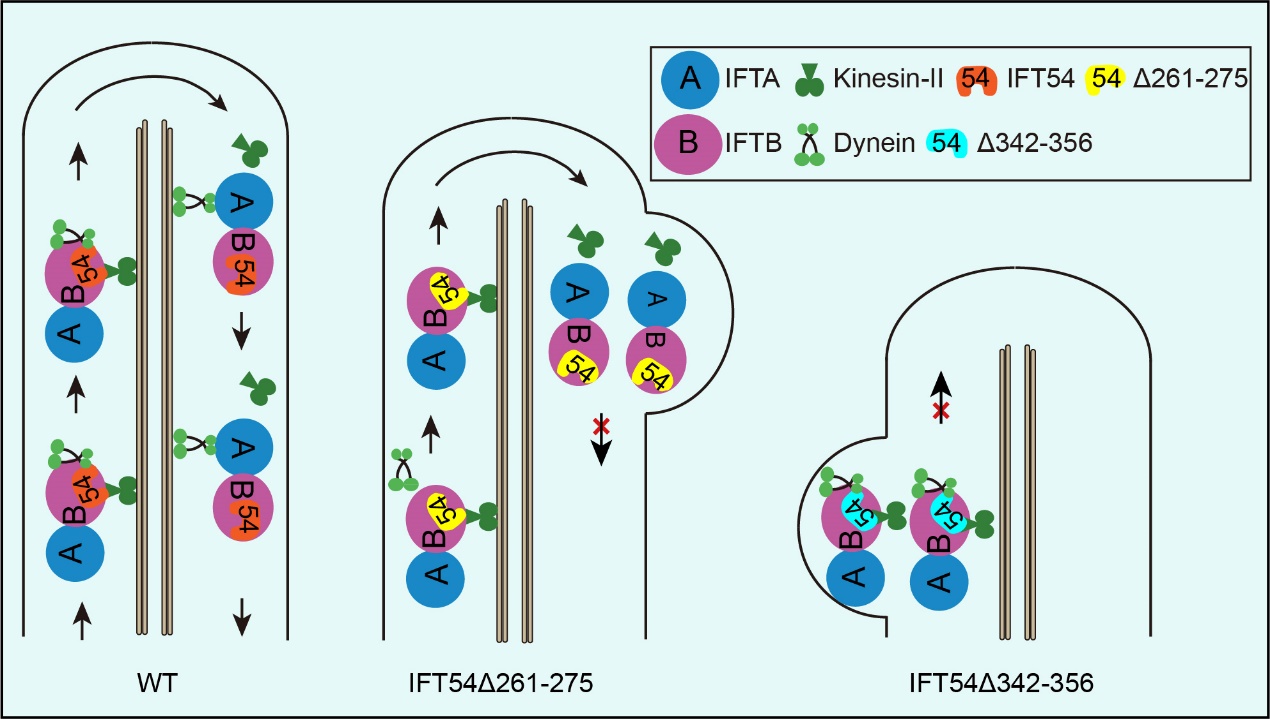IFT54同驱动蛋白kinesin-II和IFT dynein直接互作。Kinesin-II负责IFT的正向运输,即纤毛基部到顶端的运输;IFT dynein参与IFT的反向运输,即纤毛顶端到基部的运输。在IFT的正向运输过程中,IFT54与马达蛋白kinesin-II和IFT dynein同时互作,确保IFT的正常进行。缺失IFT54 261-275片段,IFT dynein不能同IFT复合物结合,导致IFT dynein不能进入纤毛,反向运输受阻,最终导致IFT蛋白复合物在纤毛顶端积累;而缺失IFT54 342-356片段干预kinesin-II的运动,进而抑制IFT的正向运输,导致IFT蛋白复合物在纤毛基部积累,纤毛不能正常组装,形成极短的纤毛。