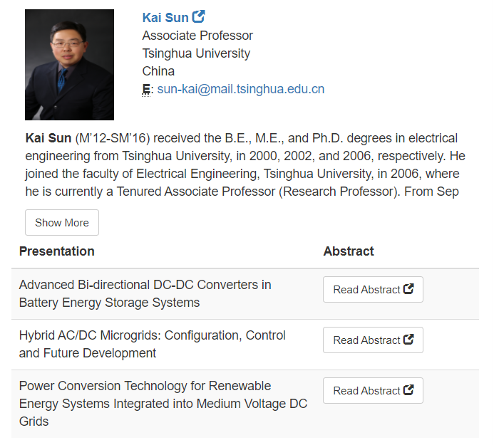 孙凯,星空体育电机系长聘副教授、博士生导师、系主任助理、电力电子与电机系统研究所所长。主要研究方向为新能源系统和多能微电网中的电力电子技术。出版专著3部,发表论文300余篇,其中IEEE/IET期刊论文70余篇。2013年获中达青年学者奖,2017年获中国电源学会科学技术奖青年奖,2019年当选IET Fellow。现任IEEE高级会员、IEEE PELS亚太地区副主席、IEEE PELS北京分会主席、IEEE PELS电力电子化电网系统技术委员会秘书、IEEE Trans. Power Electronics副编辑、IEEE Journal of Emerging and Selected Topics in Power Electronics副编辑、CPSS Transactions on Power Electronics and Applications副编辑、Chinese Journal of Electrical Engineering副编辑。曾任IEEE ECCE2020大会公共宣传主席、IEEE eGrid2019组织委员会主席、IEEE ECCE2017技术程序委员会副主席、2018IEEE国际未来能源挑战赛(IFEC2018)共同主席。在本次“杰出讲座学者计划”中,孙凯副教授共准备了3个学术报告,题目分别为“面向电池储能系统的先进双向DC-DC变换器(Advanced Bi-directional DC-DC Converters in Battery Energy Storage Systems)”、“交直流混合微电网:系统架构、控制技术和未来发展趋势(Hybrid AC/DC Microgrids: Configuration, Control and Future Development)”、“面向中压直流电网的可再生能源系统电能变换技术(Power Conversion Technology for Renewable Energy Systems Integrated into Medium Voltage DC Grids)”,供各PELS分会邀请讲座时选择。