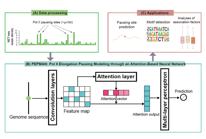 真核生物的转录是一个高度复杂且被准确调控的动态过程,RNA聚合酶II(RNA polymerase II, Pol II)作为转录过程(特别是转录延伸阶段)的核心分子成员,对遗传信息的传递起着关键作用。研究表明,在转录延伸过程中,普遍存在Pol II暂停(Pol II pausing)现象,其参与下游基因的表达调控、影响基因可变剪切的发生,与细胞分化、发育等生命活动息息相关。目前,Pol II暂停相关的转录调控机制研究主要依赖于NET-seq(Native elongating transcript sequencing)等高通量测序技术,成本高、需要一定实验周期。因此,如何实现在全基因组水平上快速、高效的分析Pol II暂停的偏好位点及其序列特征,以及其与相关转录因子间的关系,是转录调控领域亟待解决的技术难点。为了解决这一问题,来自星空体育的曾坚阳、赵诞团队采用基于注意力机制(attention mechanism)的卷积神经网络对全基因组上的Pol II暂停位点进行预测。在NET-seq数据集上,其预测准确率均显著优于现有机器学习模型。此外,研究组通过分析模型的注意力机制以及分析模型在基因组上特定位点的预测值,进一步探索了Pol II暂停的生物学特征以及和其他转录调控机制的关系,包括:发现了决定Pol II暂停的序列特征以及其与暂停位点的关系;通过分析不同可变剪切方式位点上Pol II的暂停倾向,提供了Pol II影响可变剪切的可能生物学机制;全面分析了Pol II与转录因子、组蛋白修饰、DNA甲基化发生的相关性;发现模型能够很好的弥补测序数据深度不足带来的缺陷。