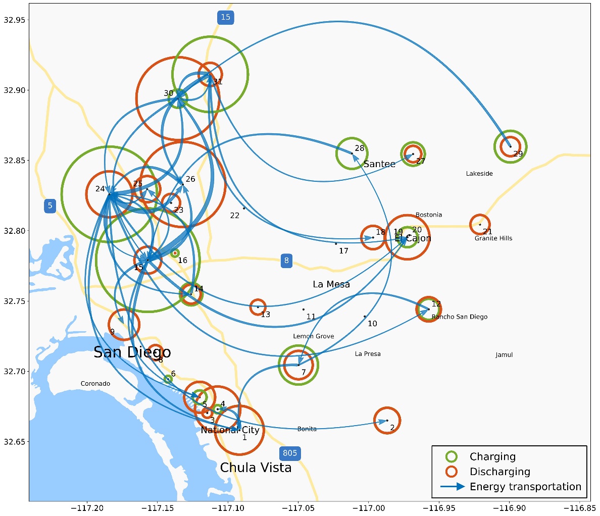 图4 移动储能系统在圣地亚哥地区附近的最优运行方案示例
