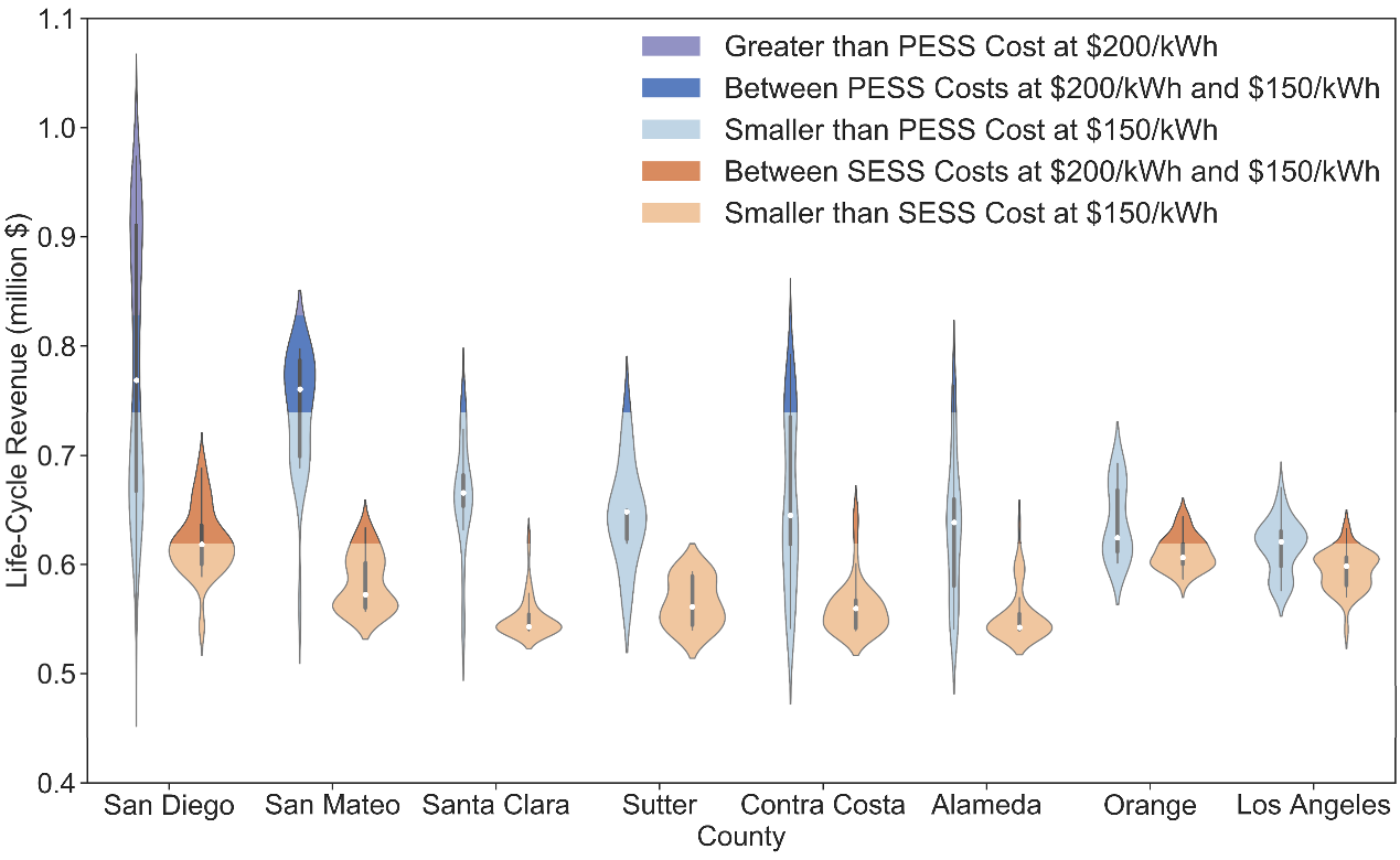 该研究构建了一个基于混合整数规划的决策模型,用以计算移动储能系统的最优运营方案和最大全寿命周期利润。模型中的决策变量包括移动储能系统的充放电方案、在不同地点间的移动方案。其全寿命周期利润为其全寿命周期内通过充放电参与电力系统电力平衡调节所获总利润,减去运输和损耗成本。在这一决策模型的基础上,研究以由Tesla Semi和Powerpack(特斯拉研发的电动半挂式卡车和电池储能系统)组成的移动储能系统为例,考察了系统在美国加州电网(CAISO)的运行情况。研究发现,即使将移动储能系统的运行限制在以CAISO中某节点为中心、半径为10英里的范围内,移动储能系统的全寿命周期利润相比固定储能系统就可以有大幅提升,在圣地亚哥等电网堵塞比较严重的地区尤为显著。