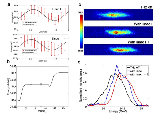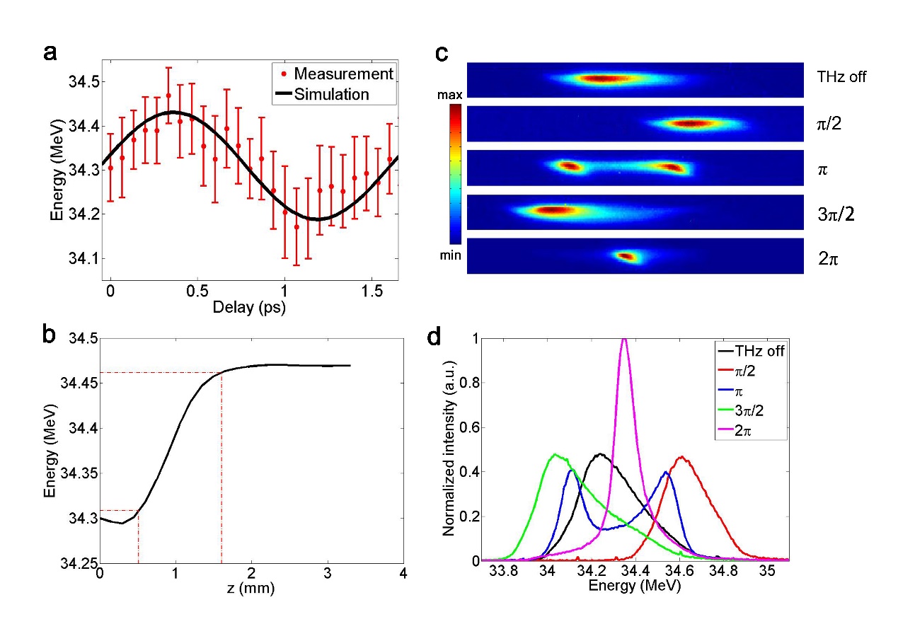 星空体育工程物理系加速器实验室长期致力于高亮度电子束物理、技术与应用的研究。瞄准这个研究方向,2017年7月黄文会、唐传祥教授提出在工程物理系加速器实验室发展太赫兹加速技术,深入研究新加速原理的核心物理与创新技术,进而建设紧凑型全光太赫兹加速器实验平台的基本构想。博士生胥汉勋深入开展了太赫兹加速实验的理论分析和物理设计,与团队成员于2018年4月和2019年12月在星空体育加速器实验室汤姆逊散射源束线上开展高梯度级联太赫兹加速实验。研究团队采用灵巧的双束实验方案(如图2所示),利用驱动电子束基于相干渡越辐射(coherent transition radiation,CTR)产生强太赫兹脉冲,在太赫兹介质管加速器中对后续跟随的超短电子束进行两级同步加速。该方案利用同源的驱动激光在加速器束线上同时产生强太赫兹波(132μJ)和超短的相对论电子束(34.3 MeV,460fsFWHM)并保证了二者的天然的时间同步特性,使得强太赫兹电场(1.1 GV/m)能够稳定的对相对论电子束进行同步加速。经过不断调试和优化,研究团队成功的实现了太赫兹波对相对论电子束的级联加速,观测到了清晰的全束团加速现象,所实现的加速梯度(155 MV/m)和加速能量(204 keV)相较于当前世界上已报道的结果提高了一个量级(如图3、4)。