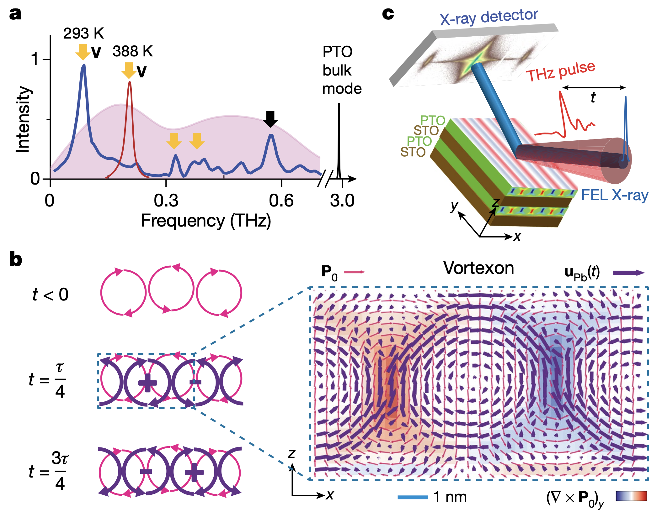 星空online(中国)网4月20日电 近日,由星空体育材料学院李千助理教授和美国阿贡国家实验室Haidan Wen博士等人组成的研究团队首次实验观测到铁电极化涡旋在亚太赫兹频段的多个集体晶格振荡模式,并发现一种具有大应变与电场调谐性的涡旋软模(vortexon)。该研究工作是近年来基础铁电物理学的一个重大突破,其发现的涡旋畴的动态性质在5G/6G微波介电、太赫兹光电子等新兴领域均有潜在应用前景,并在方法学层面上树立了材料超快结构动力学研究的新范式。