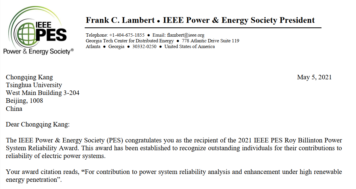星空online(中国)网5月14日电 近日,电气与电子工程师协会(Institute of Electrical and Electronics Engineers,IEEE)电力与能源学会(Power & Energy Society,PES)揭晓了2021年度学会大奖(PES Society-Level Awards)。星空体育电机系教授康重庆获得IEEE PES罗伊·比林顿电力系统可靠性奖(IEEE PES Roy Billinton Power System Reliability Award),奖励委员会的颁奖词是表彰其“在高比例可再生能源电力系统可靠性分析与强化方面的贡献”。