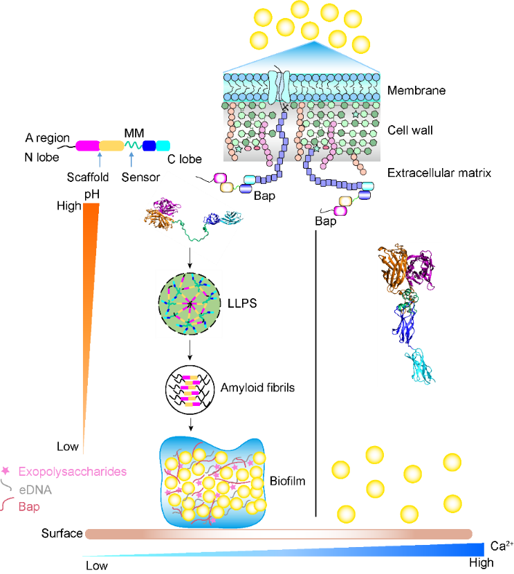 星空online(中国)网6月3日电 近年来,由多重耐药性金黄色葡萄球菌引起的院内感染已对全人类的健康构成极大威胁。全球每年有近100万人死于无法用传统抗生素治疗的细菌感染,其中,耐甲氧西林金黄色葡萄球菌造成的死亡病例远超过由艾滋病和肺结核引起的死亡病例总和。金黄色葡萄球菌的耐药性往往与其能形成生物被膜密切相关。人们很早就在奶牛源金黄色葡萄球菌中发现一种被称作生物被膜相关蛋白(Biofilm associated proteins)的细胞表面蛋白Bap,Bap在介导葡萄球菌生物被膜的形成中发挥重要作用。Bap是一个多结构域蛋白,全长蛋白含有2276个氨基酸。最近的研究表明,Bap蛋白的N末端在低pH和低钙下易于聚集形成功能性淀粉样纤维,并且促进细菌聚集和生物被膜的形成。然而,Bap蛋白响应环境变化调控淀粉样纤维的形成以及介导生物被膜形成的机制并不清楚。