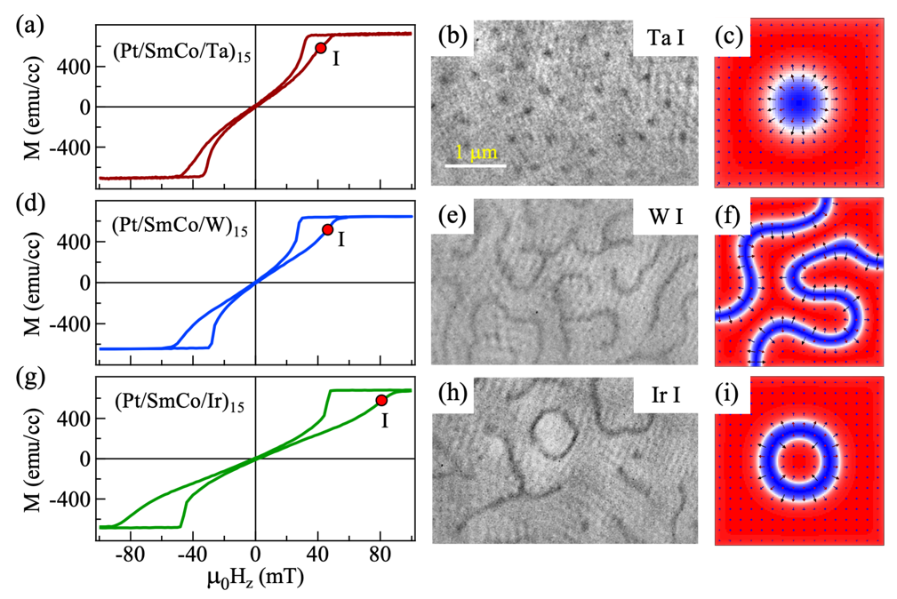 图2:[Pt/SmCo5/N]15(N = Ta,W, Ir)多层膜的面外磁滞回线,相应的多层膜中利用X射线磁元二色谱观测的磁畴图像,以及微磁学模拟验证。X射线透射显微镜的测量以及微磁学模拟结果表明,在[Pt/SmCo5/Ta]15多层膜中能够形成100纳米级的斯格明子,在[Pt/SmCo5/W]15多层膜中能够形成手性条纹畴,而在[Pt/SmCo5/Ir]15多层膜中能够形成圆环状的磁结构(skyrmionium,拓扑数为0)。