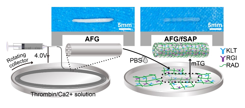 王贵怀教授团队与王秀梅教授团队通过医工交叉合作,开发了一种新型的多级定向纤维蛋白纳米纤维水凝胶/功能化自组装多肽(Hierarchically aligned fibrin hydrogel/functionalized self-assembling peptides AFG/fSAP)复合水凝胶。该水凝胶以无毒、可吸收的纤维蛋白和多肽作为原料,通过液态接收静电纺丝技术合成了具有多级定向结构的纳米纤维AFG,并与具有促血管、促神经再生功能的自组装多肽fSAP形成互穿网络结构。