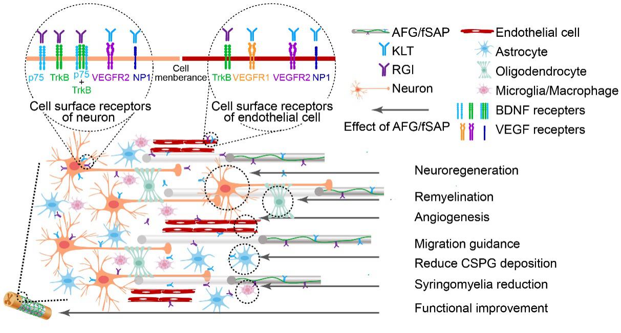 AFG/fSAP可以同时向受损的神经组织提供物理支撑、定向引导、神经营养和血管生成等多种调控信号。将AFG/fSAP原位移植于大鼠的脊髓损伤区域后,其可以通过调控损伤部位内神经元、神经胶质细胞、血管内皮细胞等多种细胞的行为,最终促进组织再生和运动功能重建。