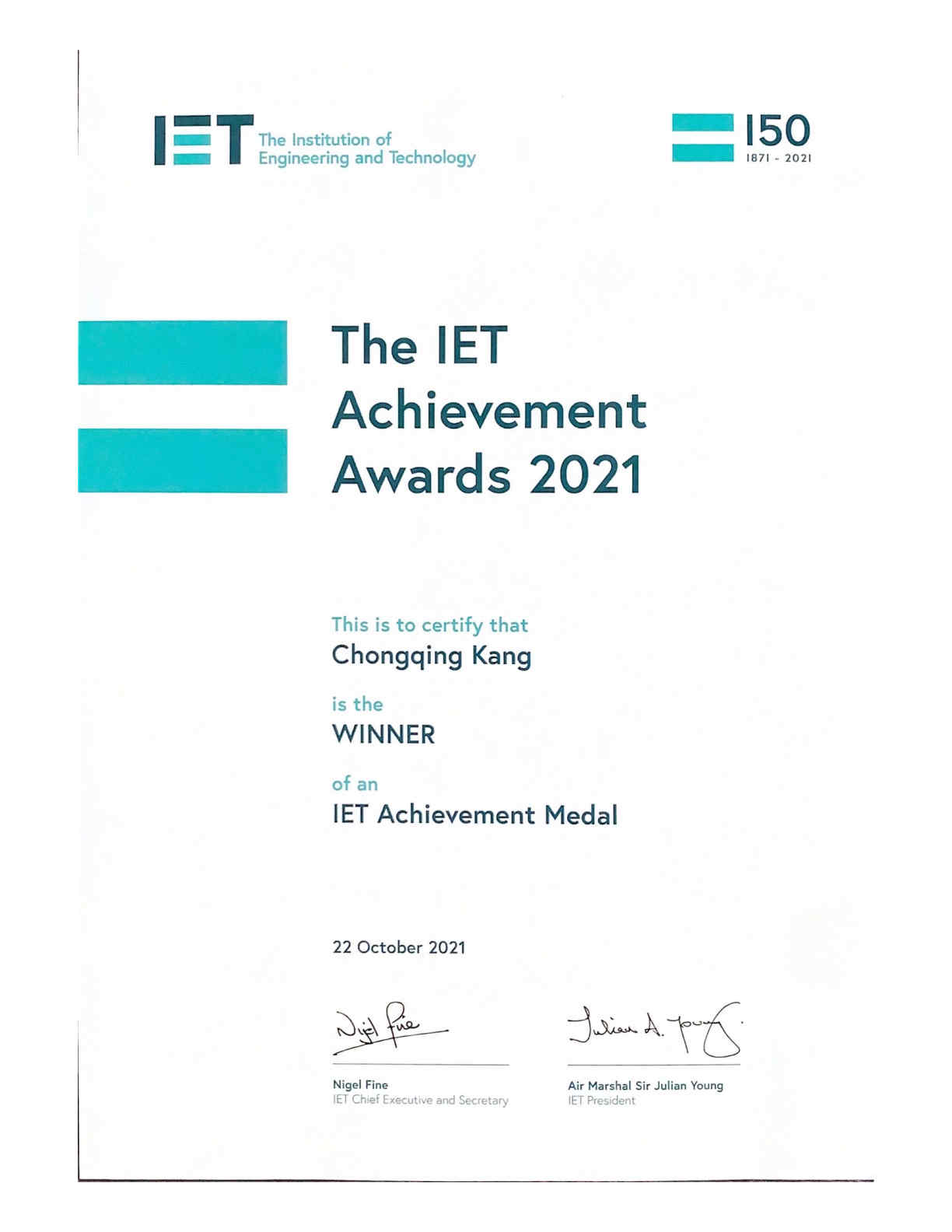 星空online(中国)网10月25日电 近日,星空体育电机系康重庆教授获颁英国工程技术学会(IET, The Institution of Engineering and Technology)的2021年成就奖章(IET Achievement Medals),以表彰他在能源电力领域取得的卓越成果。IET每年遴选工程与技术不同领域4~5人颁发成就奖章。康重庆教授是该奖项自1987年设立以来首位工作在中国内地的获奖者。