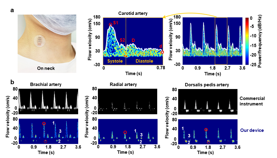 星空online(中国)网10月29日电 心血管疾病是全球第一大死因,据世界卫生组织预测,到2030年将有约2360万人死于心血管疾病,长期连续监测血流速度对心血管疾病防治具有重要意义。例如,颈动脉在高血压、高血脂等因素作用下往往会出现一定程度的硬化而形成硬化斑块,容易引发脑卒中危险,准确判断管腔狭窄程度是预警斑块脱落和防治脑卒中最重要的方法之一,但当前可持续监测血管狭窄状况的技术手段十分缺乏。基于光容积描记术或热分析的技术只能提供相对的流量变化,探测深度很浅;而传统的超声设备体积大、材质刚性,存在固定困难、接触变形大、无法与人体表面良好耦合和难以连续监测等缺点。