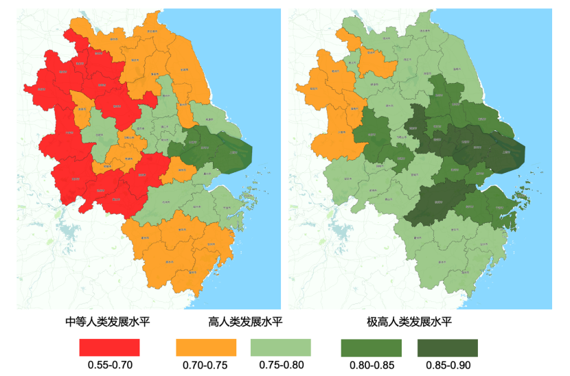 研究发现,长三角地区的HDI指数已从2010年的0.743上升至2020年的0.814,整体进入极高人类发展水平,迈上了人类发展的新台阶。在省级层面,江苏和浙江从高人类发展水平迈入极高人类发展水平,安徽从中等人类发展水平迈入高人类发展水平。在市级层面,处于极高人类发展水平的城市数量和覆盖人口大幅提升,从2010年的上海、苏州、无锡等3市扩展到上海、南京、无锡、苏州、杭州、常州、宁波、南通、绍兴、扬州、镇江、舟山、泰州、嘉兴、合肥、湖州、芜湖等17市,覆盖人口从4000万上升到1.29亿,占区域总人口比例从19%上升到55%。