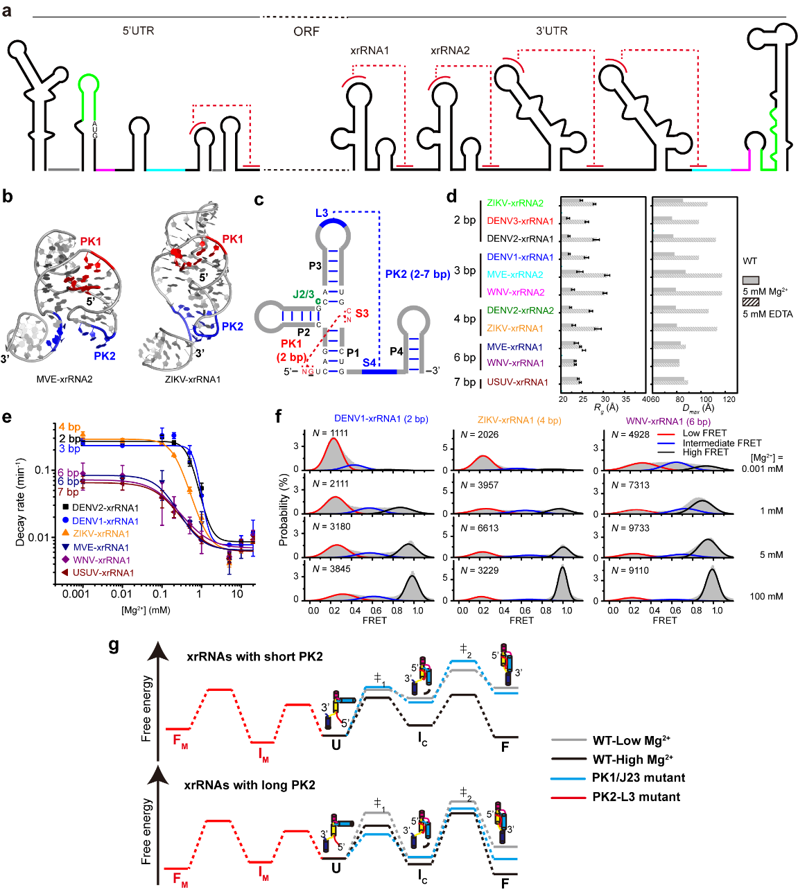 黄病毒包括登革病毒、寨卡病毒和西尼罗河病毒等可在人群中引起感染,并导致一系列潜在的严重疾病。由于仍缺少有效的药物和疫苗,黄病毒的传播仍持续在全球形成健康威胁。黄病毒抗核酸外切酶RNA(xrRNA)是一类位于黄病毒基因组3’非翻译区的RNA结构元件(图1a),可以折叠成独特的环状结构(图1b),并抵抗宿主5’→3’核糖核酸外切酶Xrn1的降解,导致宿主细胞中亚基因组RNA(sfRNA)的形成与积累,后者与病毒的致病性和免疫逃逸密切相关。研究表明,在黄病毒家族中,xrRNA的一级序列与高级结构都是高度保守的。在稳定其环状高级结构的三级相互作用模体中,存在两个假结结构PK1和PK2,其中PK1的长度为2bp,而PK2的长度从2-7bp不等(图1c)。黄病毒xrRNA的PK2长度变化的生理意义,包括对xrRNA的结构、构象动态以及抵抗Xrn1的降解功能的影响尚不清楚。