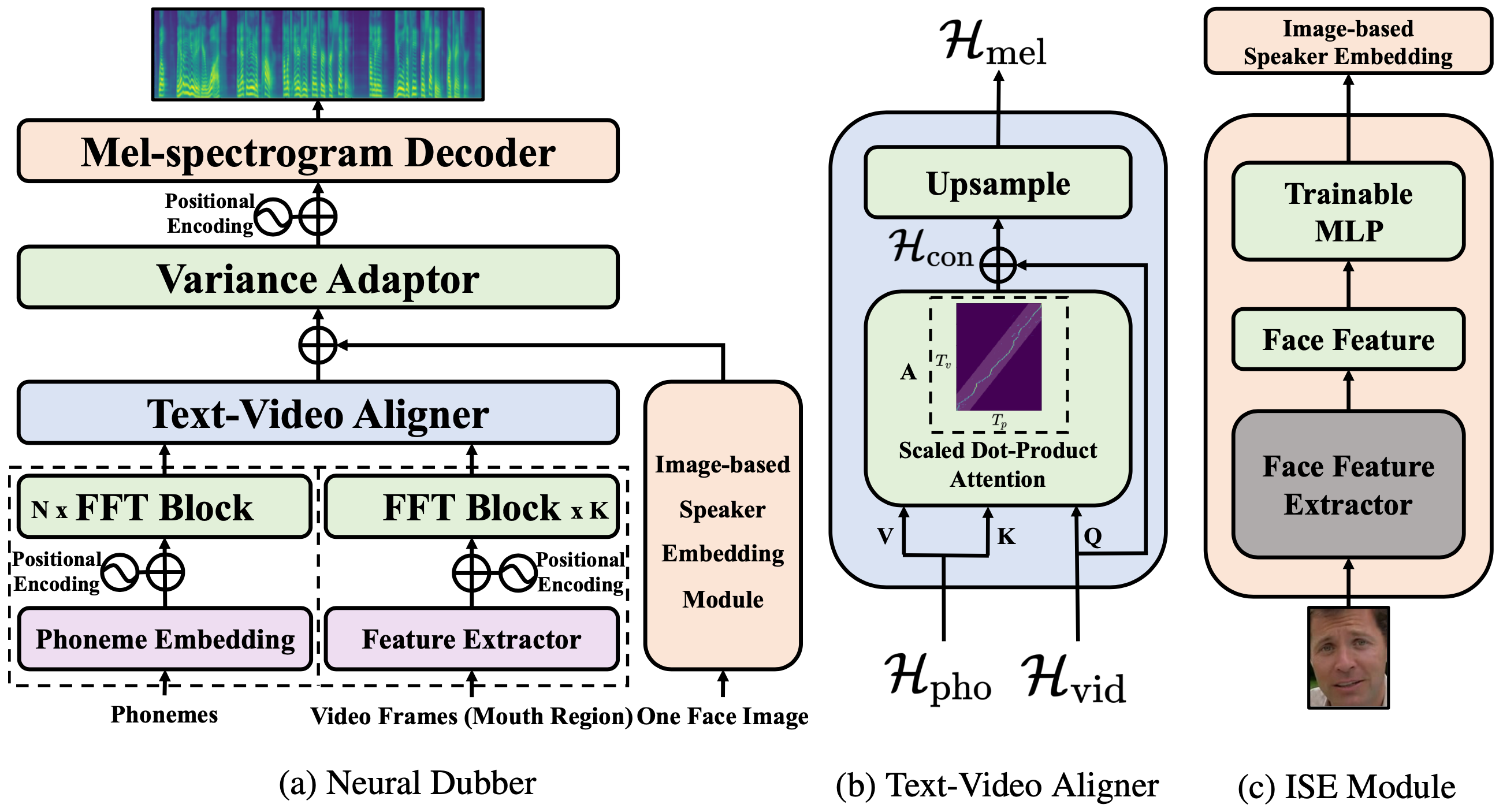 该研究团队提出的神经网络配音器(Neural Dubber)旨在解决自动视频配音(AVD)任务。这是第一个解决AVD任务的神经网络模型:能够从文本中端到端地并行合成与给定视频同步的高质量语音。Neural Dubber是一种多模态文本到语音 (TTS) 模型,它利用视频中的嘴部运动来控制生成语音的韵律,以达到语音和视频同步的目的。此外,该工作还针对多说话人场景开发了基于图像的说话人嵌入(ISE)模块,该模块使神经网络配音器能够根据说话人的面部生成具有合理音色的语音。