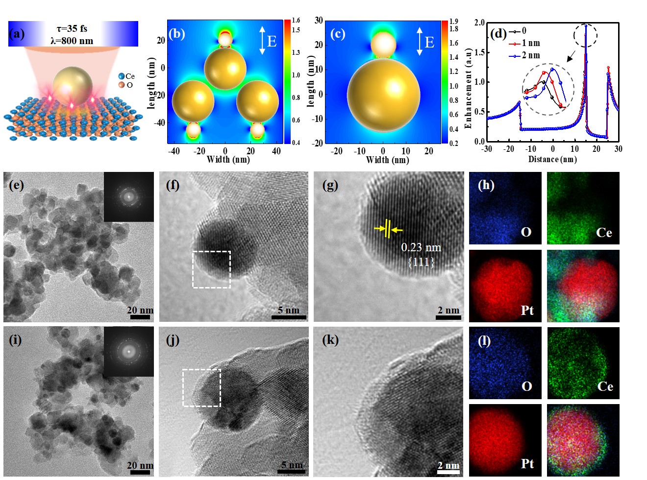 超快激光诱导SMSI之后的表征:激光辐照过程中局部增强电场FDTD模拟(a-d),新鲜Pt/CeO2的TEM和Mapping(e-h),激光辐照后Pt/CeO2的TEM和Mapping(i-l)(从上到下)
