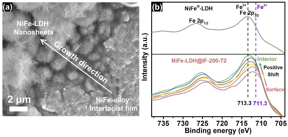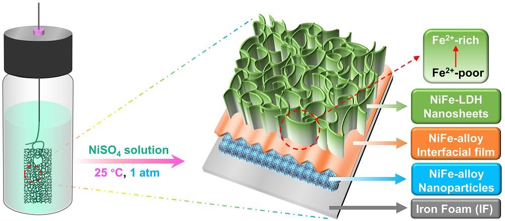 星空online(中国)网12月3日电 氢气是一种高密度的能量载体和重要的化工原料,耦合可再生能源发电的电解水是一种可持续发展的制氢方法,当前电解水的效率主要受限于其阳极析氧反应(OER)较高的过电势。为了提高电解水的效率,需要使用电催化剂降低OER的过电势。利用腐蚀法在泡沫铁上制备的自支撑镍铁层状双氢氧化物(NiFe-LDH@IF)因其良好的OER电催化性能被认为是最具有应用前景的OER电催化剂之一。然而目前NiFe-LDH@IF的生长机制还不清楚,而且不同腐蚀条件对NiFe-LDH@IF电催化性能的影响还不甚了解。这些认知的缺乏严重阻碍了NiFe-LDH@IF的发展和应用。