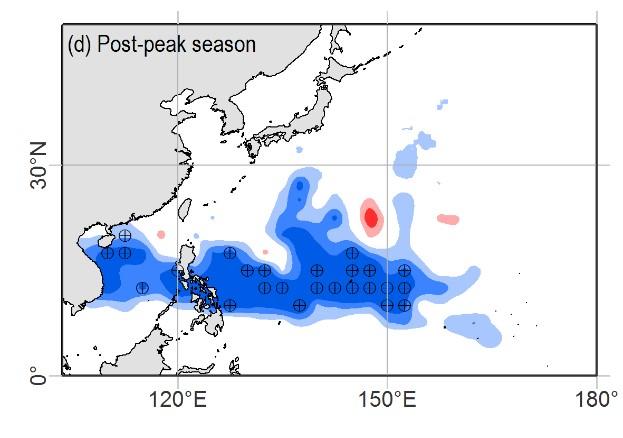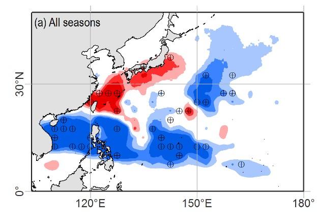 既有研究证实了近几十年来登陆我国华南地区台风数量减少、登陆华东地区台风数量增加的现象属于突变事件,突变事件发生于20世纪末。那么,能否将其简单理解为台风登陆位置由华南地区向北偏移至华东地区呢?答案并非如此。星空体育近岸海洋动力学研究团队研究首先指出,登陆华南地区台风数量减少和登陆华东地区台风数量增加是两个独立的现象。其中,登陆华南地区的台风数量减少是由于西行台风在10-12月显著减少,这一现象与西北太平洋台风生成数量减少有关;登陆华东地区的台风数量增加是由于西北行台风在7-9月显著增加,这一现象与西北太平洋台风生成位置向西偏移有关。