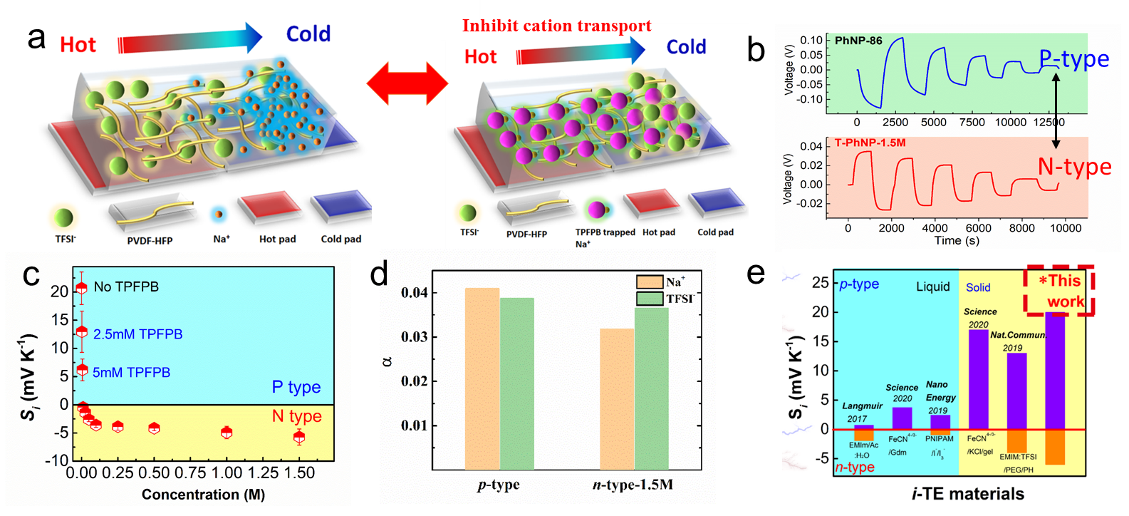 图1 (a) P-N型转换调控示意图,(b)电压响应方向对比图,(c)P型至N型塞贝克系数变化图,(d)P型和N型离子产生熵变图,(e)已报道的P-N型塞贝克系数范围对比图