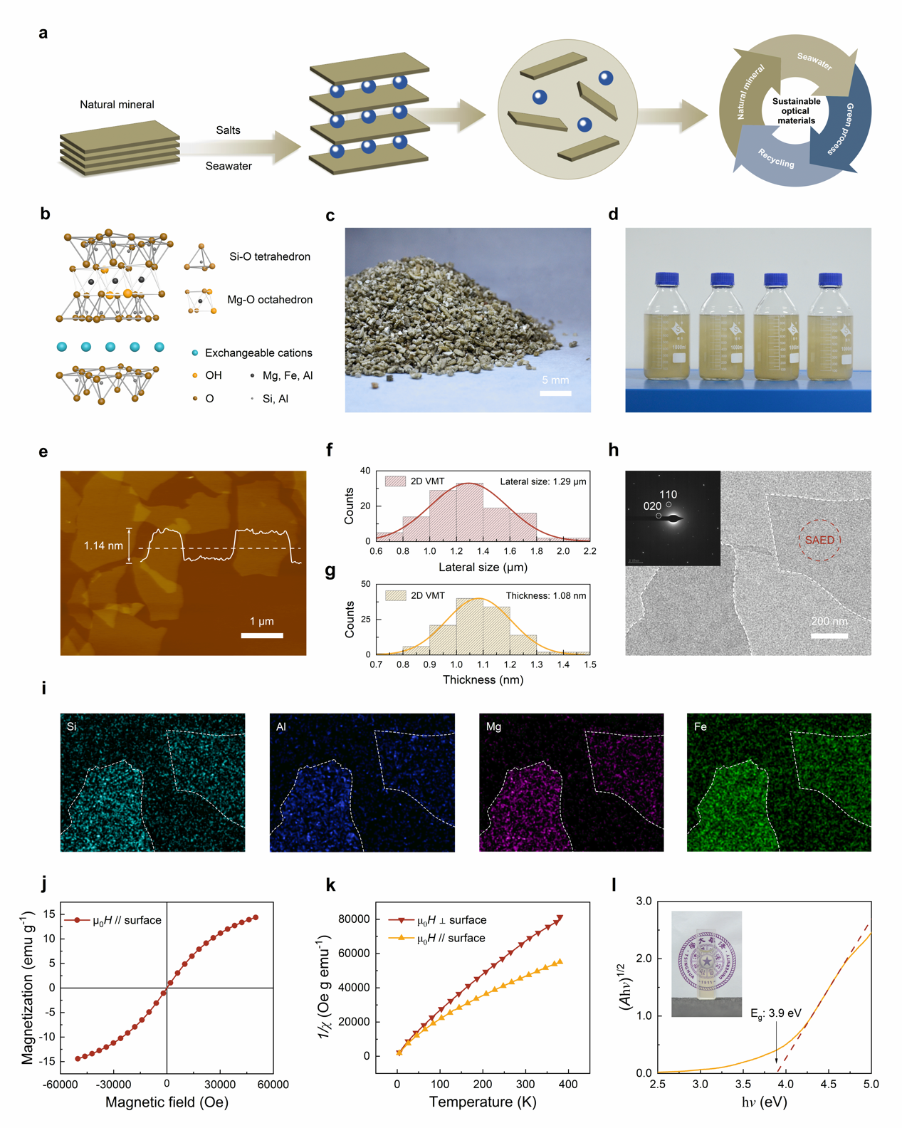 研究人员采用氯化钠、氯化锂等常见的盐溶液从层状蛭石原料大量制备了径厚比达到103的单层蛭石,其单元层由两个四面体片层夹合一个八面体片层构成。以上单层蛭石具有顺磁性响应特性,面内面外的磁化率存在各向异性,其较大的光学带隙(3.9eV)也为其在可见光全波段的光学调制打下了基础。以上制备过程能够实现闭环无废,未剥离的蛭石原料和盐溶液可以循环复用。在可能的工业化大规模生产中,人们还有望利用海水进一步降低成本。