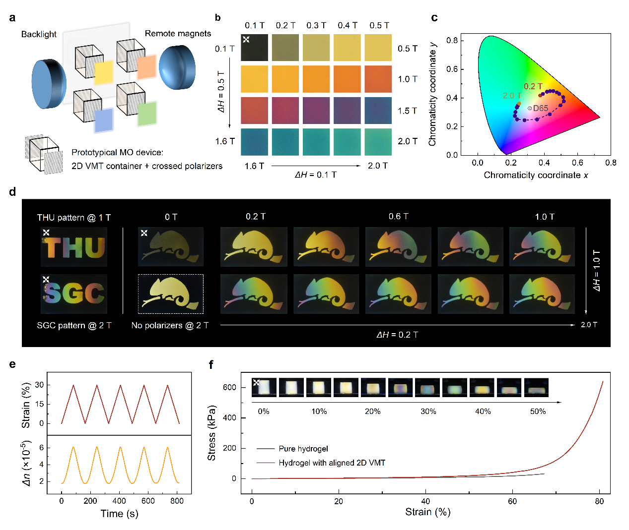 最后,研究人员基于以上发现验证了一系列光学原型应用,例如永磁铁操纵的光开关、颜色显示单元和力色智能传感器等。其中,光开关具备40ms级别的响应速度,光强循环保持率在98%以上。在磁场控制下,颜色显示单元能够实现多种色调转换,动态显示黄、橙、红、紫、蓝、绿等一系列独立或渐变颜色。通过光固化技术,研究人员还制备了基于二维蛭石的光学各向异性水凝胶,进一步实现了自支撑、无能耗的力色可视化传感。以上原型验证说明了基于二维功能矿物的磁光器件具备广阔的应用前景,有望成为与有机液晶电光器件相互补充的新技术。