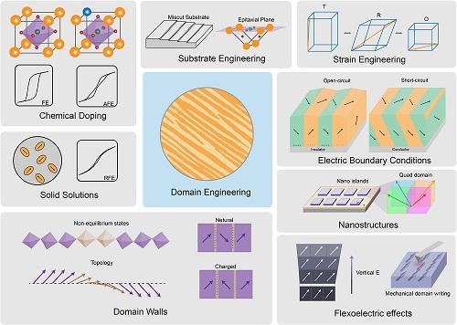 星空online(中国)网3月22日电 铁酸铋(BiFeO3)同时具有铁电性和反铁磁性,是非常罕见的室温多铁性材料。自2003年这一特性被证实后,铁酸铋材料引起了学界的广泛关注和深入研究,它的结构—性能关联和调控一直是铁电和多铁领域的焦点。近期,结合团队在该领域的研究成果,材料学院教授林元华等人系统总结了多铁材料铁酸铋中基于畴工程的调控手段,综述了畴工程在调控电学性能、磁电耦合和光学特性方面的重要作用。