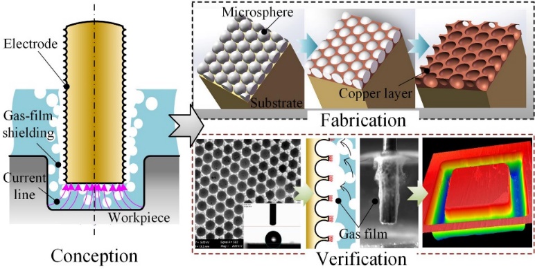 星空体育机械工程系精密微纳制造工艺与装备研究团队在前期采用侧壁绝缘膜微细电解加工研究基础上,面向解决侧壁绝缘膜不可靠、易损耗的问题,提出了一种微细工具电极侧壁疏水表面形成的“无形”绝缘气膜提高微细电解加工定域性的方法。该方法探索出单层模板自组装工艺和微细电铸工艺,制备出微纳米尺度球形阵列内凹坑构建的新型侧壁疏水表面微细工具电极。微结构微细电解加工实验表明,这种方法能有效抑制微细电解加工中侧壁杂散腐蚀,提高了微细电解加工的定域性精度。此研究为解决一直困扰微细电解加工杂散腐蚀问题提供了新的解决思路和方案,在微细棒状金属表面构建疏水表面、微结构微细电解加工等领域具有重要的学术价值和应用前景。