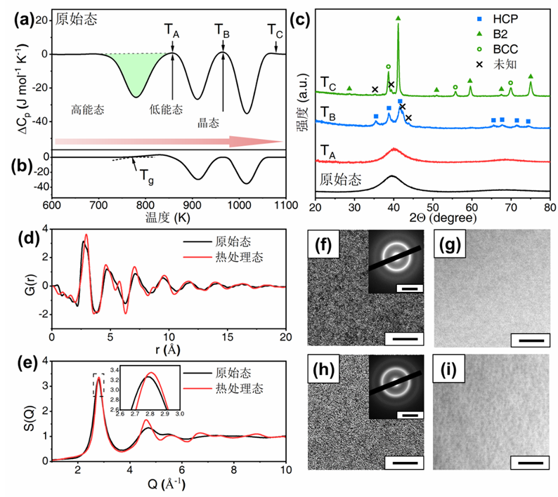 图1 原始态(a)和TA退火后(b)的NbNiZrTiCo高熵非晶合金的比热(ΔCP)随温度变化,(a)中绿色部分为玻璃-玻璃转变放热量;X射线衍射(c),同步X射线衍射((d)、(e)),高分辨透射电子显微像和选区电子衍射((f)、(h):退火前后)、和高角环形暗场像分析((g)、(i):退火前后)