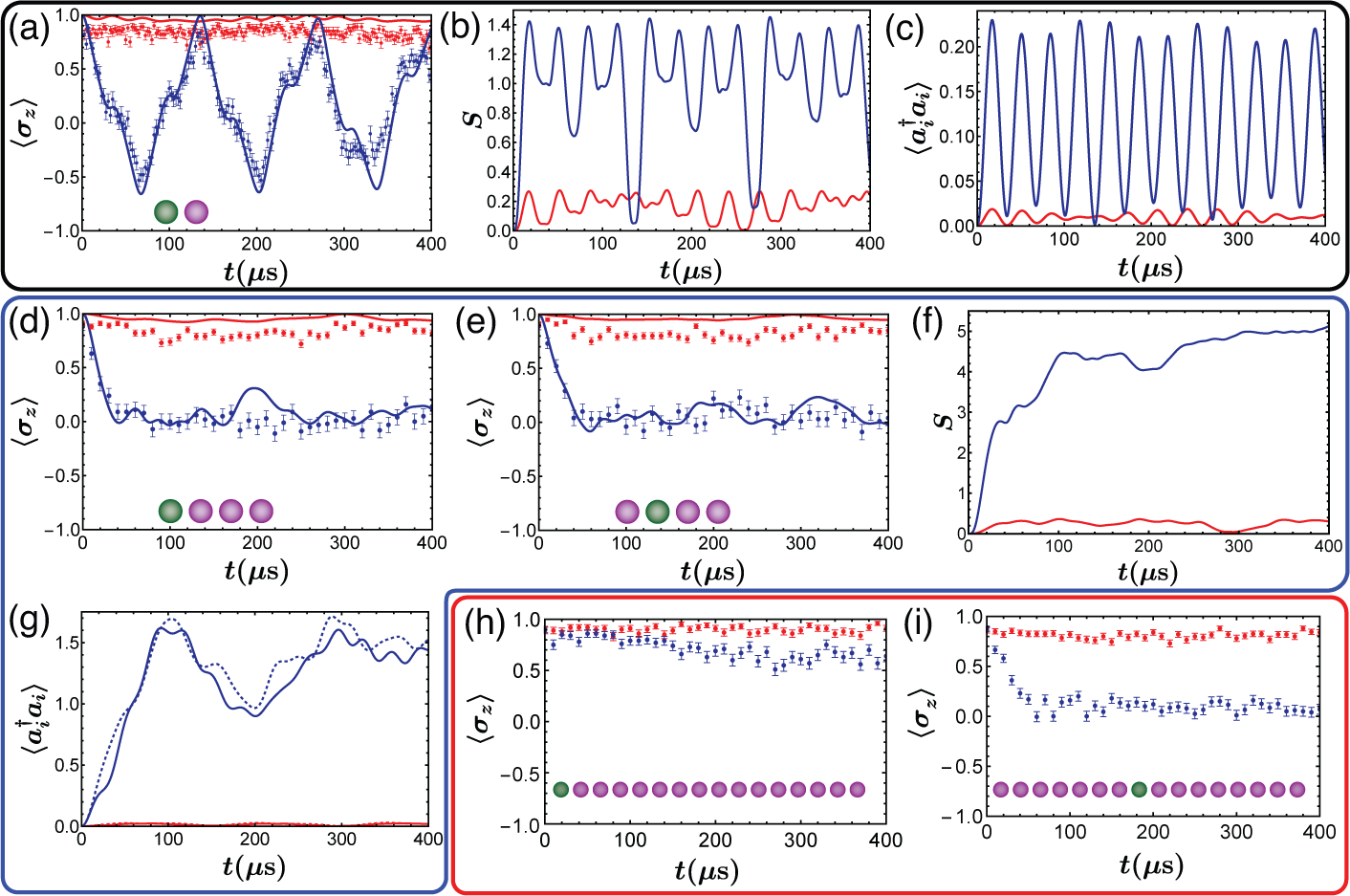 得益于离子阱量子模拟平台的高度可控性,研究人员实现了对拉比-哈伯德模型的可控量子模拟研究。研究人员通过对激光的精密操控实现了离子量子比特与局域声子的相互作用,而离子阱系统中的库伦相互作用形成了不同离子间的局域声子交换项。在这项工作中,研究人员通过量子相变和量子动力学两个方面验证了拉比-哈伯德模型的成功实现。在量子相变方面,研究人员通过绝热演化实现了相干相和非相干相之间的转化,在此过程中通过测量空间自旋关联这一序参量,成功在不同规模的离子阵列中观测到量子相变现象,且与DMRG方法近似计算的结果相符。