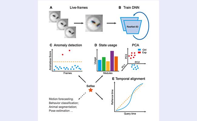 图1. Selfee利用无监督机器学习算法提取动物行为视频中的全局特征。这些特征可用于深入分析动物行为中的异常表现和时间特性