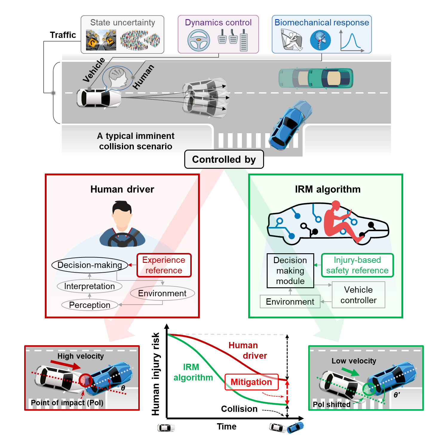 道路交通事故是全球性范围内的重大公共安全问题。由于诸多不可控因素的存在(如自车软硬件故障、行车环境恶劣等),道路交通事故仍将在未来长期存在。智能汽车凭借感知与潜在的决策能力,有望显著改善道路交通安全水平。现有安全决策通常关注规避碰撞的算法,而在面对不可避免碰撞事故场景时,忽视了在碰撞前关键时间窗口内降低伤亡风险的巨大潜力。主要技术瓶颈在于:人-车-路系统具有非线性、高动态、强耦合特性,难以准确、实时、量化评估危险场景下交通参与者(“人”)的损伤风险。