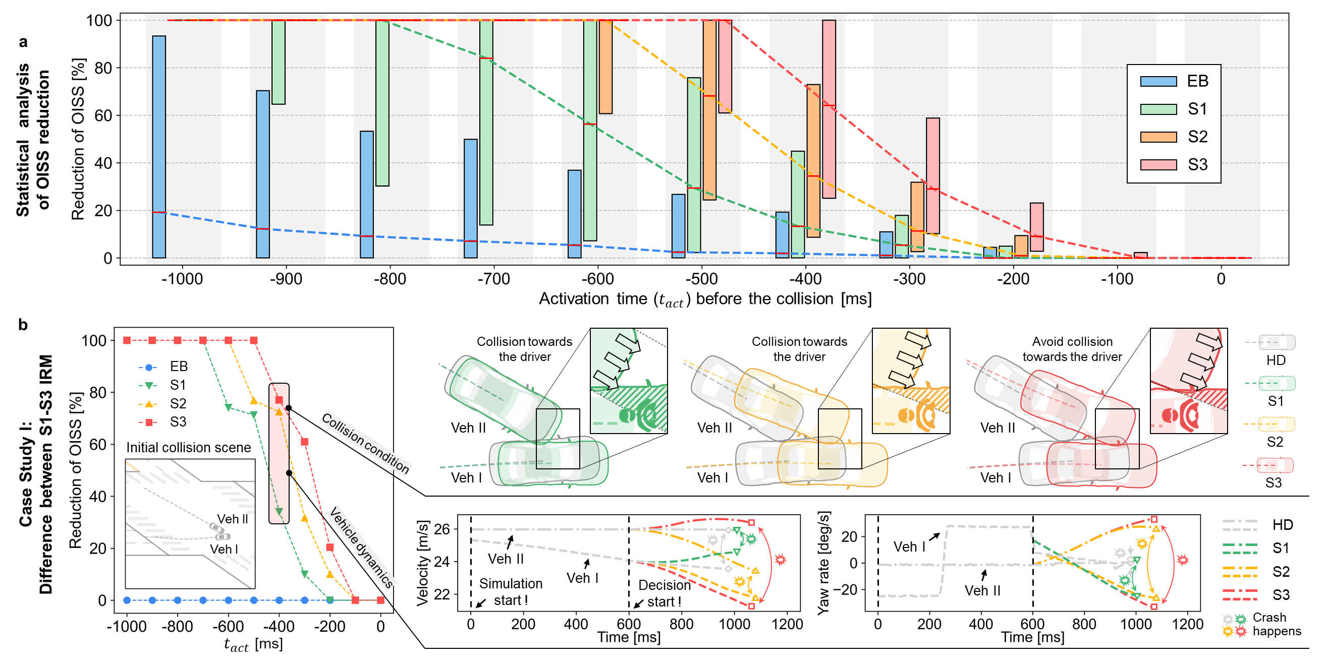 车辆学院周青、聂冰冰团队提出了危险场景智能汽车人员损伤风险动态预测方法。其核心算法(Injury Risk Mitigation-based algorithm,IRM)包括三个模块:首先,对积累的大量事故数据进行基于专家经验的清洗和预处理,建立数据驱动的人员损伤风险量化预测模型;其次,以实时更新的损伤风险预测为参考,提出了不可避免事故场景安全决策算法,在事故前约一秒时间窗口内滚动优化调整车辆行驶策略,实现损伤风险最小化;最后,依据中国交通事故深入调查(CIDAS)数据作为测试场景,量化评估人类驾驶员和该安全决策算法的损伤风险降低效果(图1)。