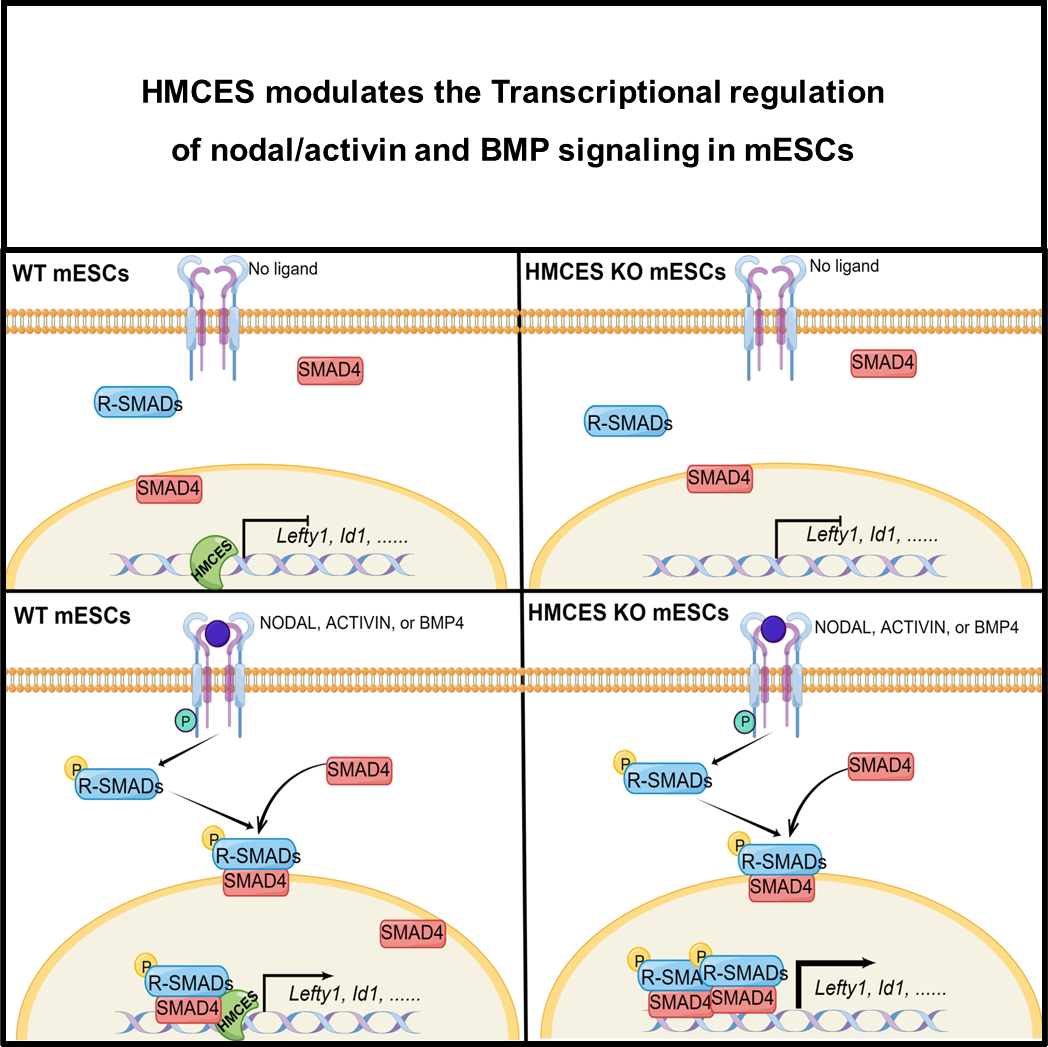 7月12日,星空体育郗乔然副教授课题组在《细胞·细胞报道》(Cell Reports)期刊在线发表题为“HMCES参与协调小鼠胚胎干细胞mESCs中activin/nodal/BMP信号通路的转录调控”(HMCES modulates the transcriptional regulation of nodal/activin and BMP signaling in mESCs)的研究论文。该研究发现,HMCES这个具有DNA损伤修复相关功能的蛋白,在小鼠胚胎干细胞中,能够在不影响DNA损伤的基础上对干细胞的分化潜力进行调控。在转录表达谱分析中发现,HMCES的敲除增强了TGF-β家族信号通路经典靶基因的转录本表达。HMCES与R-SMAD蛋白结合,共同定位于标记转录激活的修饰组蛋白处。然而,HMCES结合染色质独立于TGF-β家族信号通路。从机制上讲,HMCES竞争性地结合染色质以限制R-SMAD蛋白的结合,从而迫使R-SMAD从染色质解离并导致抑制它们的转录功能,进而影响TGF-β家族信号通路在胚胎干细胞分化中的功能。在非洲爪蟾胚胎中,HMCES敲低会导致显著的发育缺陷,并伴随着左右轴不对称异常以及lefty1的表达增加。这也表明HMCES在非洲爪蟾胚胎早期发育过程中通过影响TGF-β家族信号通路,而影响胚胎发育。总之,该研究揭示了HMCES参与协调nodal/activin和BMP信号通路的转录调控。