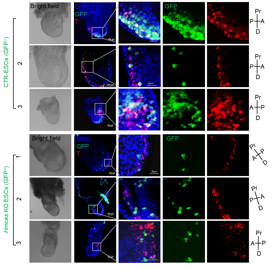 图2. 胚胎嵌合实验表明HMCES缺失抑制了小鼠胚胎干细胞产生中内胚层细胞的能力