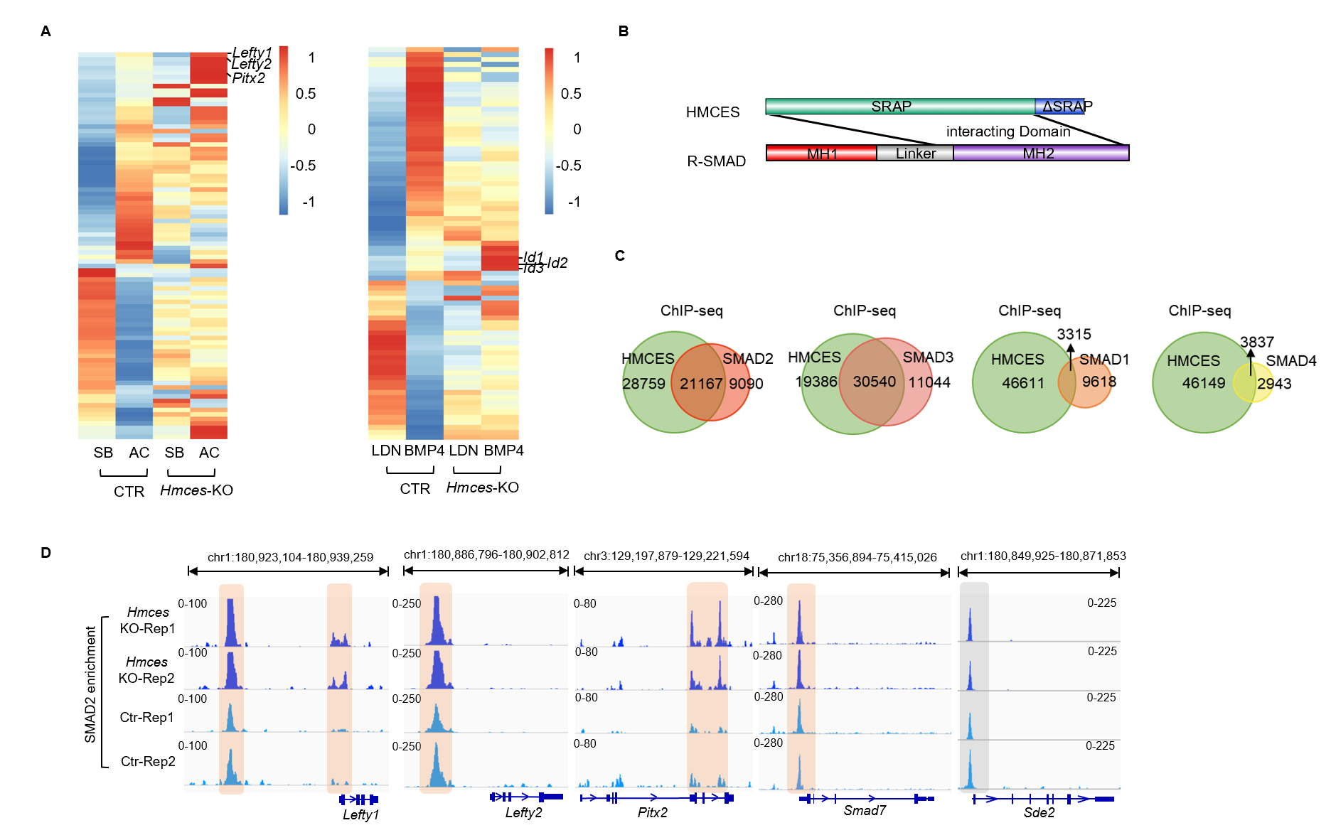 图1. HMCES与SMAD蛋白特异结合,通过空间位阻方式阻滞TGF-β/BMP信号通路直接靶基因的转录过度激活