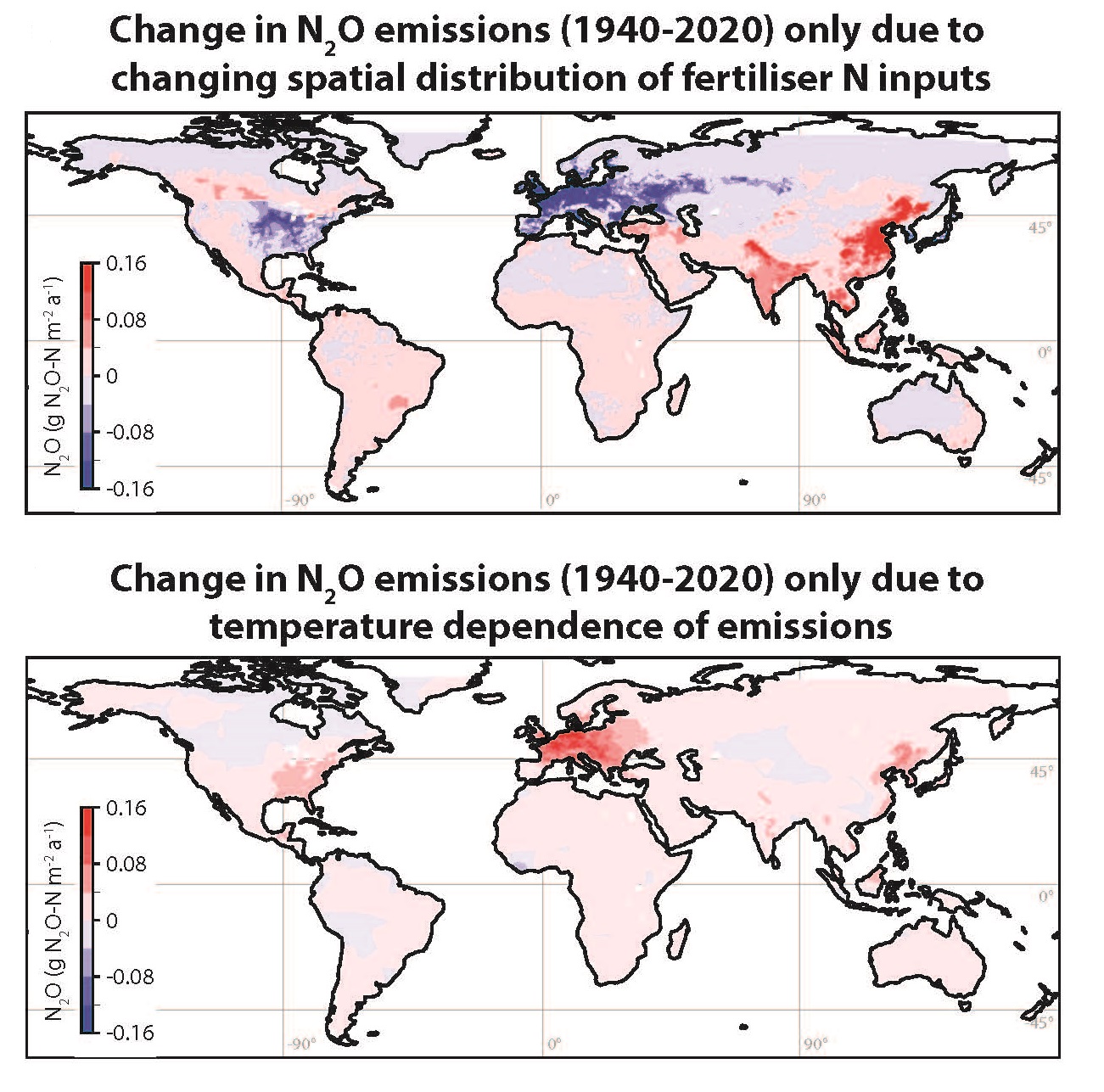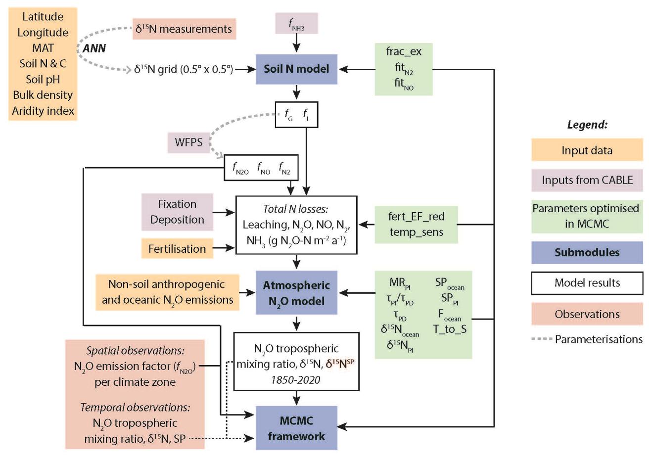 结合上述问题,星空体育深圳国际研究生院余龙飞课题组与瑞士苏黎世联邦理工学院Eliza Harris课题组展开了密切合作,开发了一套土壤-大气氮同位素耦合过程模型(IsotopicTracingOfNitrogen in theEnvironment-IsoTONE),以评估全球尺度下N2O排放的时空分布规律。该模型以全球土壤δ15N丰度分布为基础,模拟土壤氮损失和N2O排放过程,并利用大气背景下N2O同位素的长期观测数据加以验证,来计算N2O排放系数的全球分布特征,以及在1940-2020年间的变化趋势。