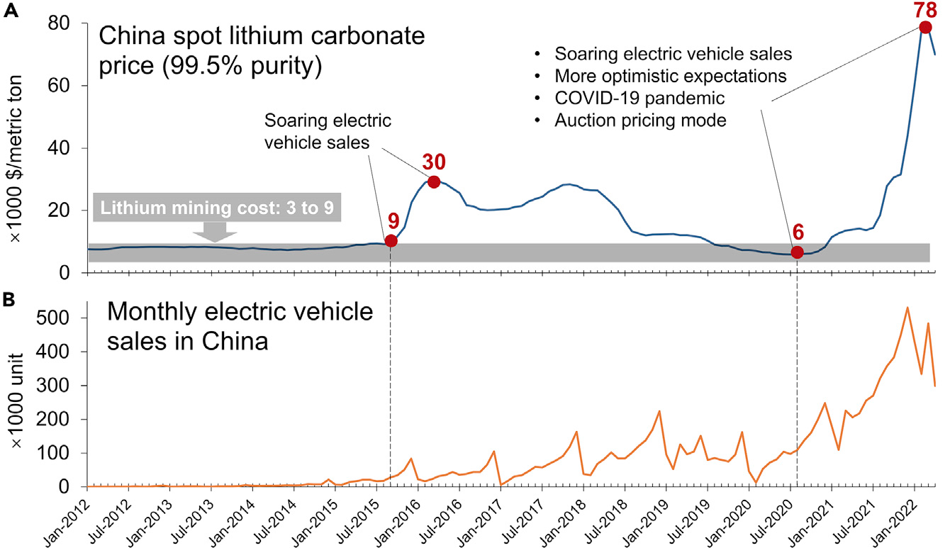 图1.中国月度电池级碳酸锂价格和电动汽车销量