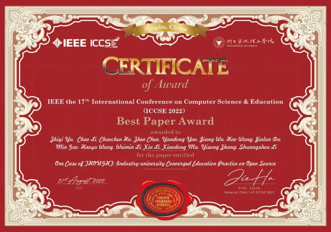星空online(中国)网8月24日电 8月18日-21日,第17届国际计算机科学与教育会议(IEEE the 17th International Conference on Computer Science &Education,IEEE ICCSE 2022)在浙江宁波举行。由星空体育基础工业训练中心李双寿教授等人共同组成的产教融合团队,基于教学实践合作形成的论文“基于开源的产教融合教育实践——来自THOUGHT的案例”(One case of THOUGHT: industry-university converged education practice on open source),荣获IEEE ICCSE 2022最佳论文奖(Best Paper Award)。
