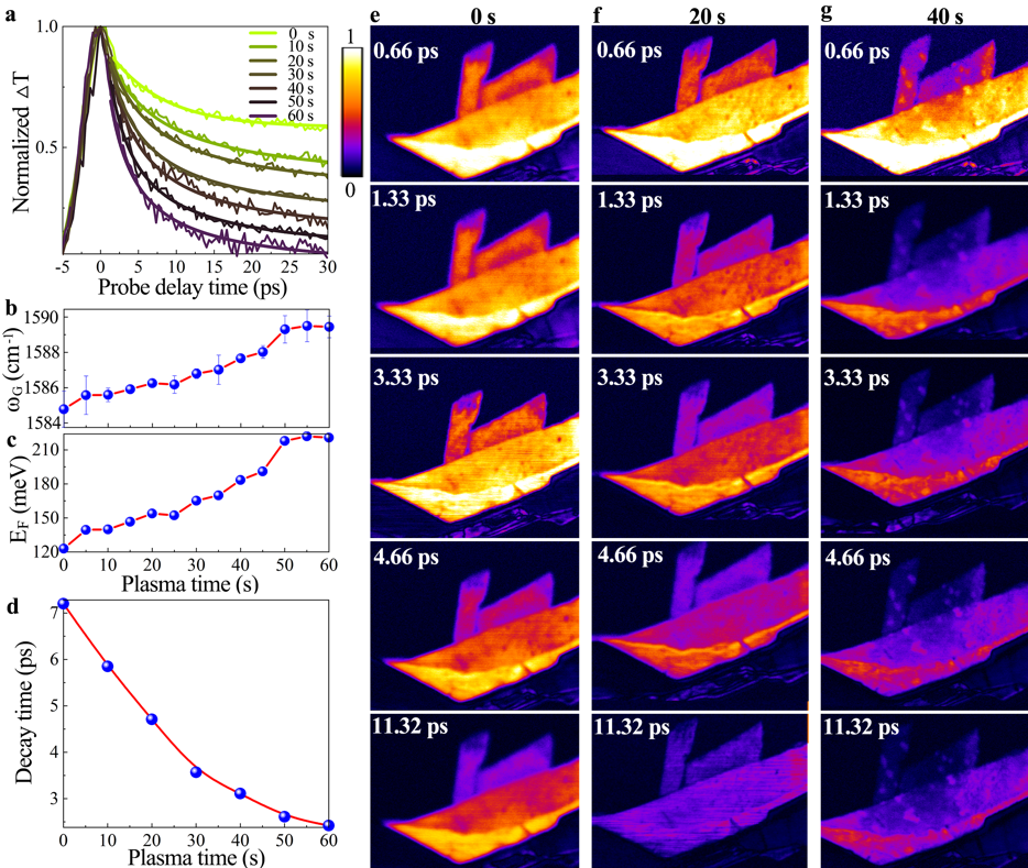 该工作中,通过在石墨烯/WS2异质结的石墨烯表面引入原子级缺陷,发现缺陷可以改变异质结的层间能量耗散途径。对于无缺陷样品,层间能量耗散途径主要为电荷转移;但引入缺陷后,缺陷提供反冲动量,打破了层间动量守恒限制,使层间电声耦合成为新的耗散途径,属于层间超碰撞过程(图1)。因此,缺陷的出现会加快范德华异质结中层间能量耗散速率。而这些能量耗散过程发生在超快尺度,课题组自主搭建了飞秒瞬态吸收成像系统,直接成像了电声耦合的超快能量耗散过程(图2),发现随着缺陷浓度的增加,电声耦合的散射时间从7.1ps加快到2.4ps,实现了利用原子级缺陷浓度调控电声耦合速率。这为揭示缺陷导致超滑失效的机理提供理论支持,也为检测摩擦界面原子级缺陷提供了新思路。